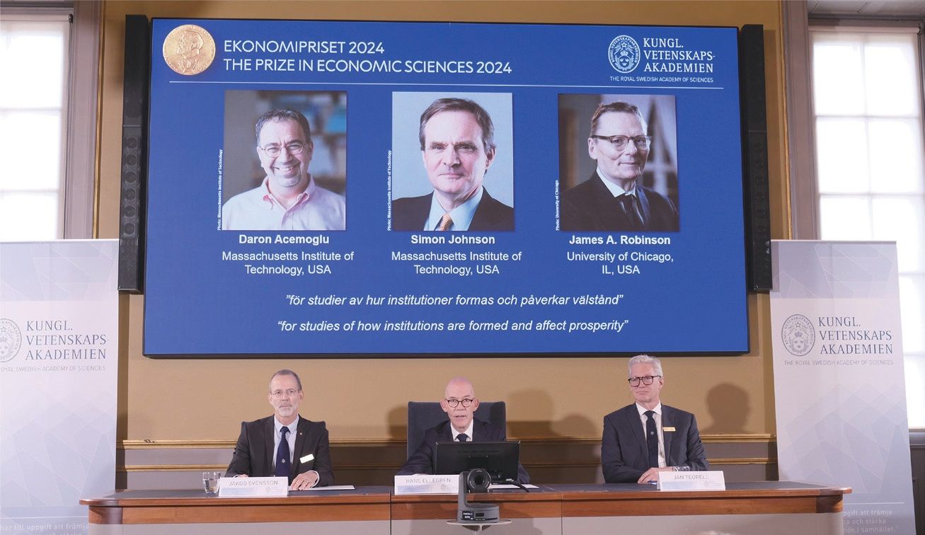 瑞典皇家科学院14日在斯德哥尔摩宣布,将2024年诺贝尔经济学奖授予三位来自美国大学的经济学家达龙·阿杰姆奥卢、西蒙·约翰逊和詹姆斯·鲁滨逊,以表彰他们在关于制度如何形成并影响经济繁荣研究领域的突出贡献。新华社图