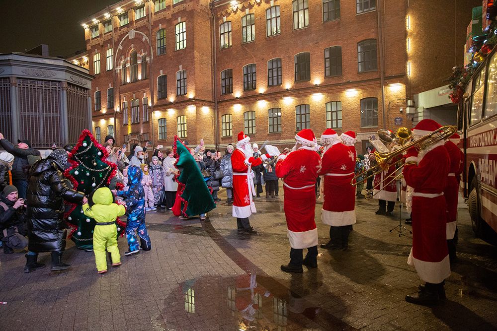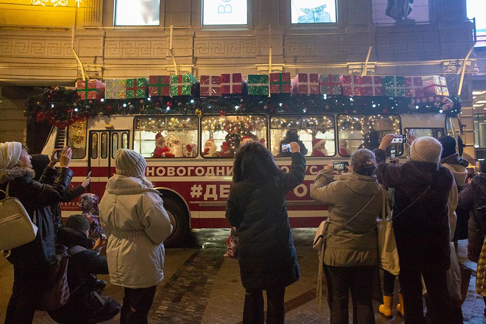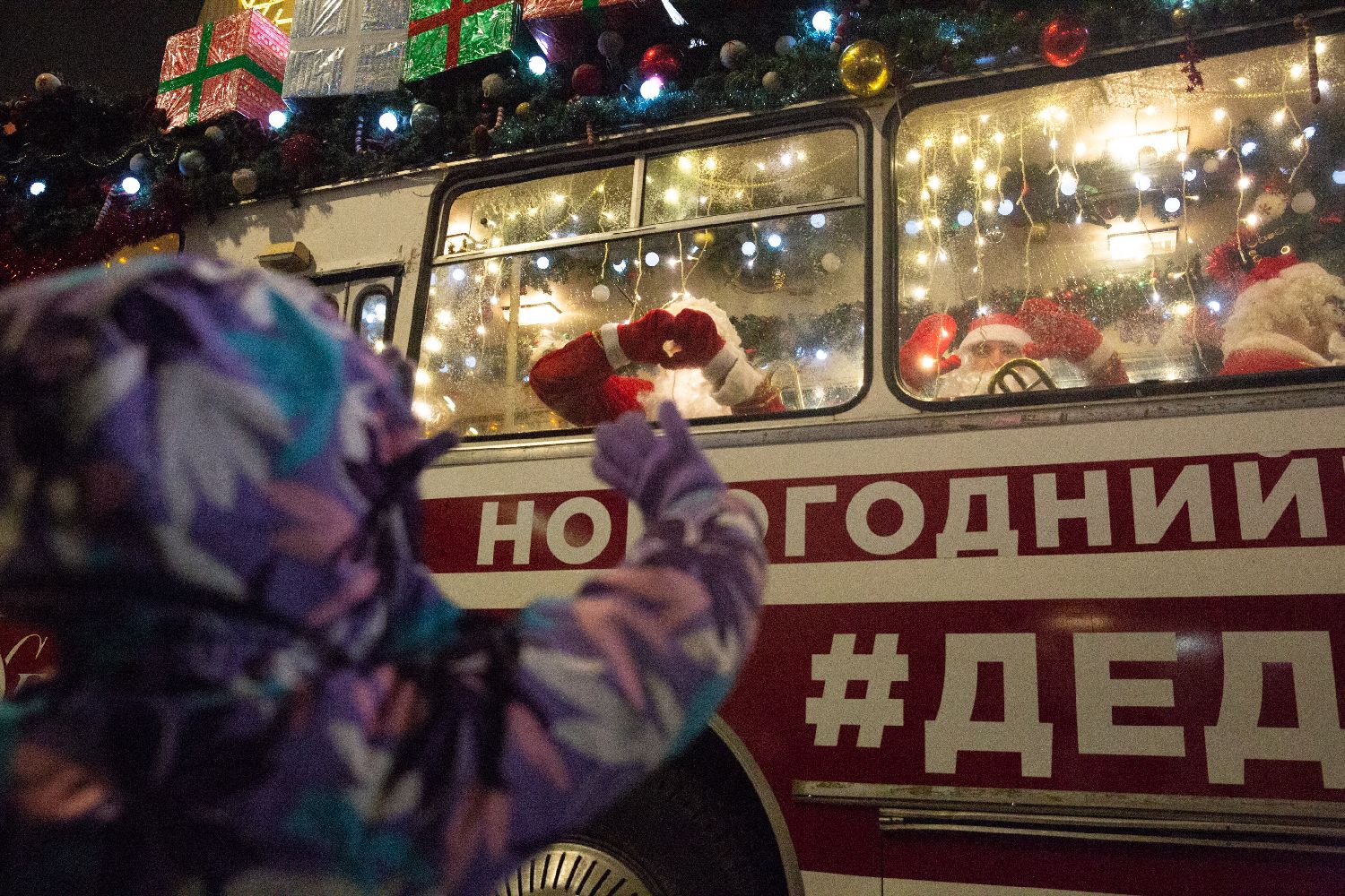 为了迎接新年,俄罗斯圣彼得堡使用红白色相间的复古节日巴士,载着“严寒老人”和“礼物”在市中心穿梭,装扮成“严寒老人”的表演者们为民众演奏乐曲。