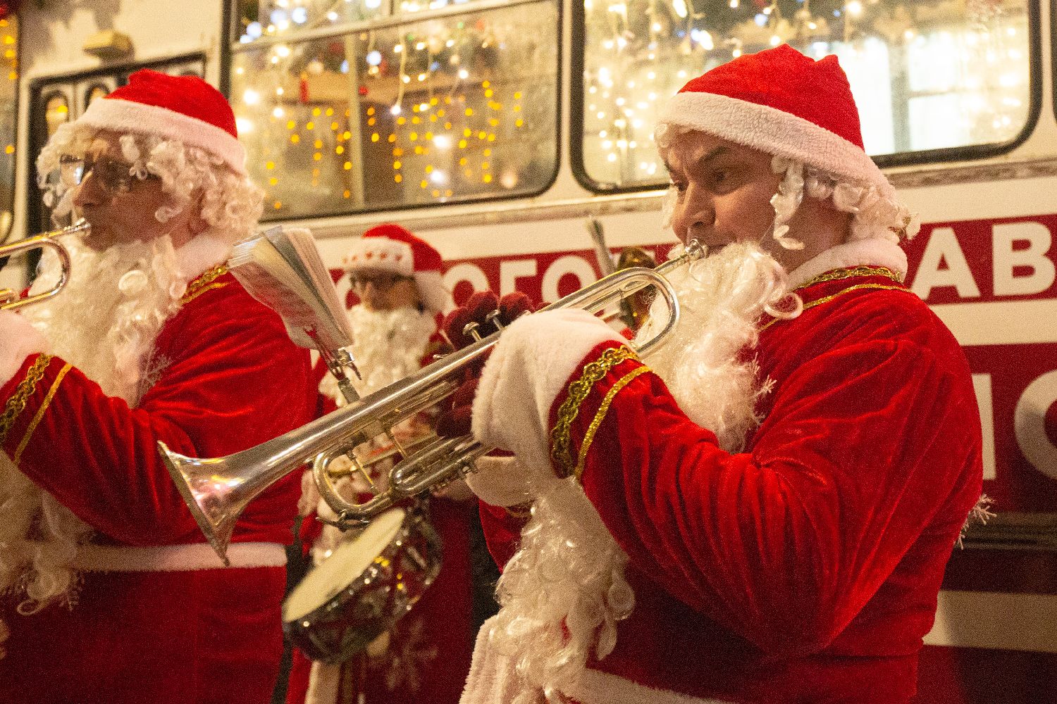 12月25日,俄罗斯圣彼得堡市民观看装扮成“严寒老人”的乐手表演。 为了迎接新年,俄罗斯圣彼得堡使用红白色相间的复古节日巴士,载着“严寒老人”和“礼物”在市中心穿梭。巴士停靠时,装扮成“严寒老人”的表演者们下车演奏乐曲,在寒冷的冬日为市民带来节日的欢乐。(图片来源:本文图片均自新华社)