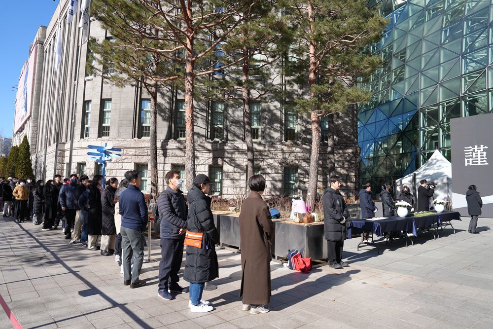 2024年的最后一天,中午时分,上百名民众在韩国首尔市政府正门前排起数十米的队伍,面色肃穆。