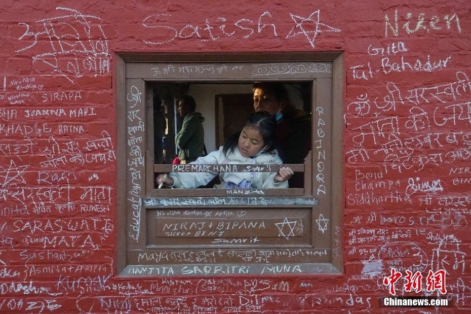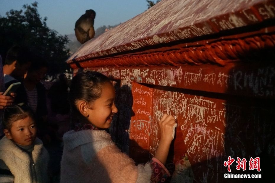 图为2月3日,尼泊尔女孩在萨拉斯瓦蒂神庙写下自己的名字。