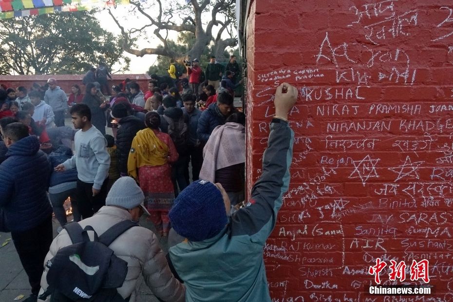 图为2月3日,尼泊尔青年在萨拉斯瓦蒂神庙写下自己的名字。