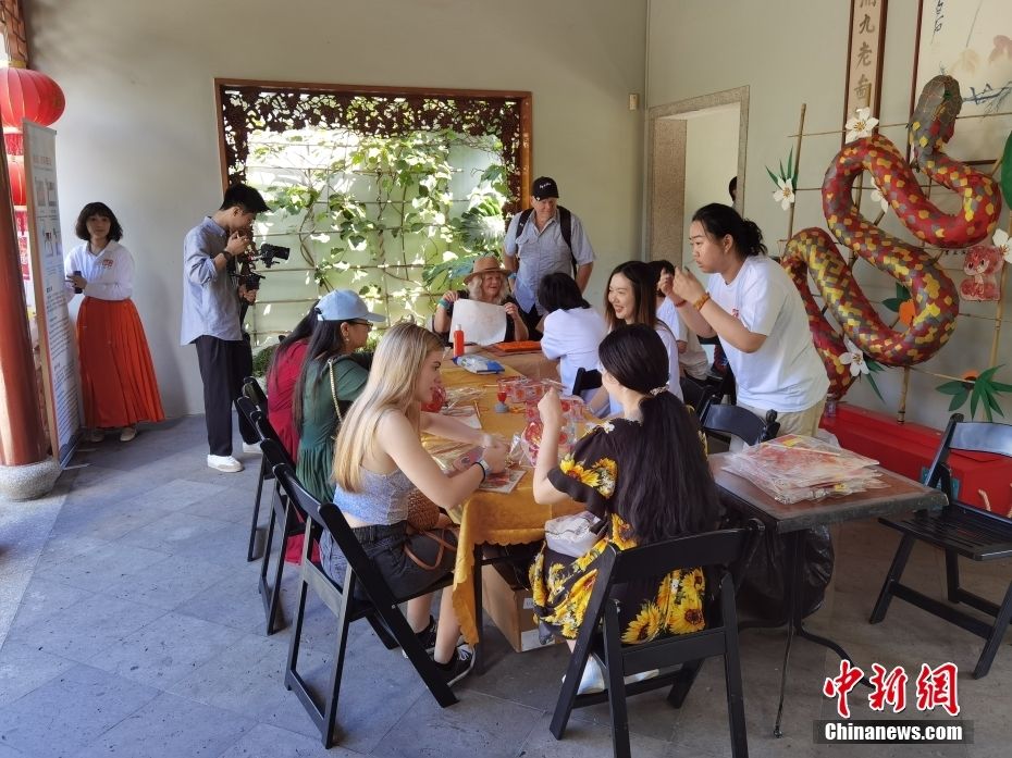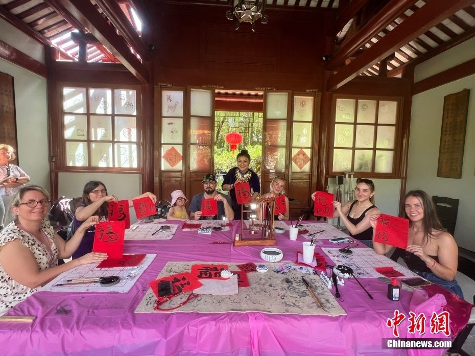 图为在书法体验区,游客在书法老师的指导下,书写“福”字,感受中国书法的魅力。(图片来源:本文图片均来自中新网)