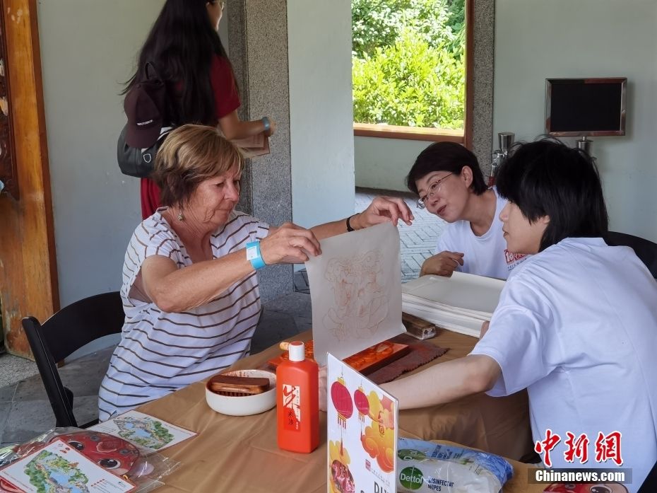 图为雕版印刷体验区,游客亲手操作上色、覆纸、拓印。
