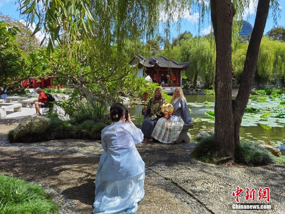 图为在汉服体验区,游客换上飘逸华美的汉服,在园林美景中拍照留念。