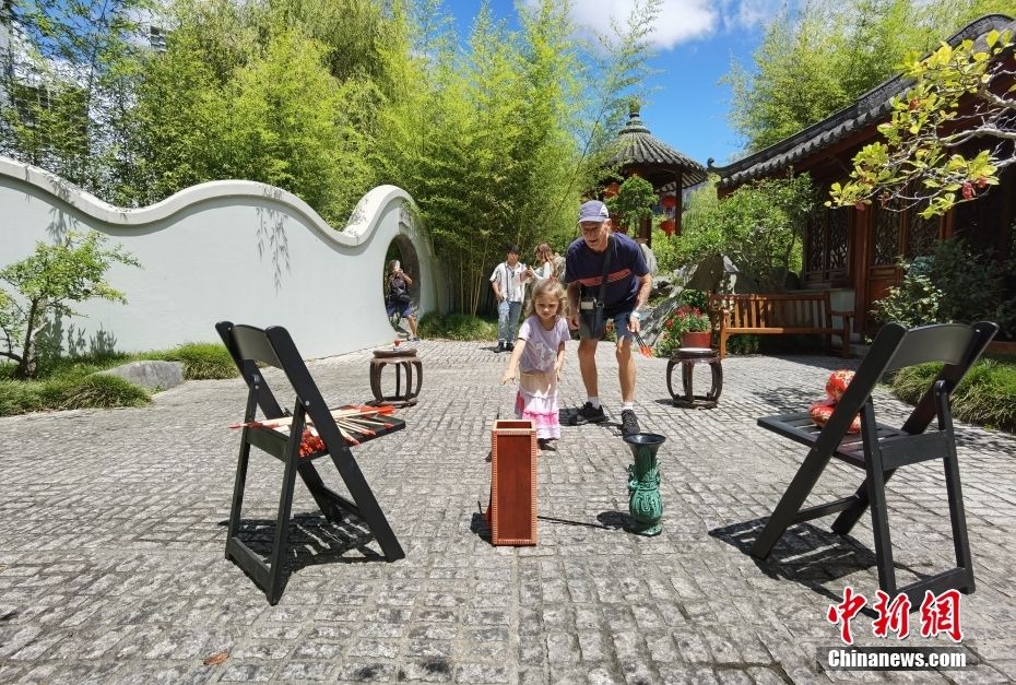 图为在投壶体验区,游客现场体验中国传统“君子六艺”之一的投壶游戏。