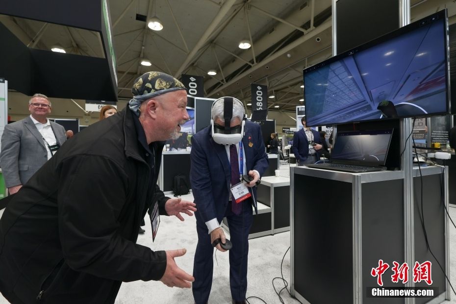 图为参会者在一家参展商展位体验虚拟现实技术应用。