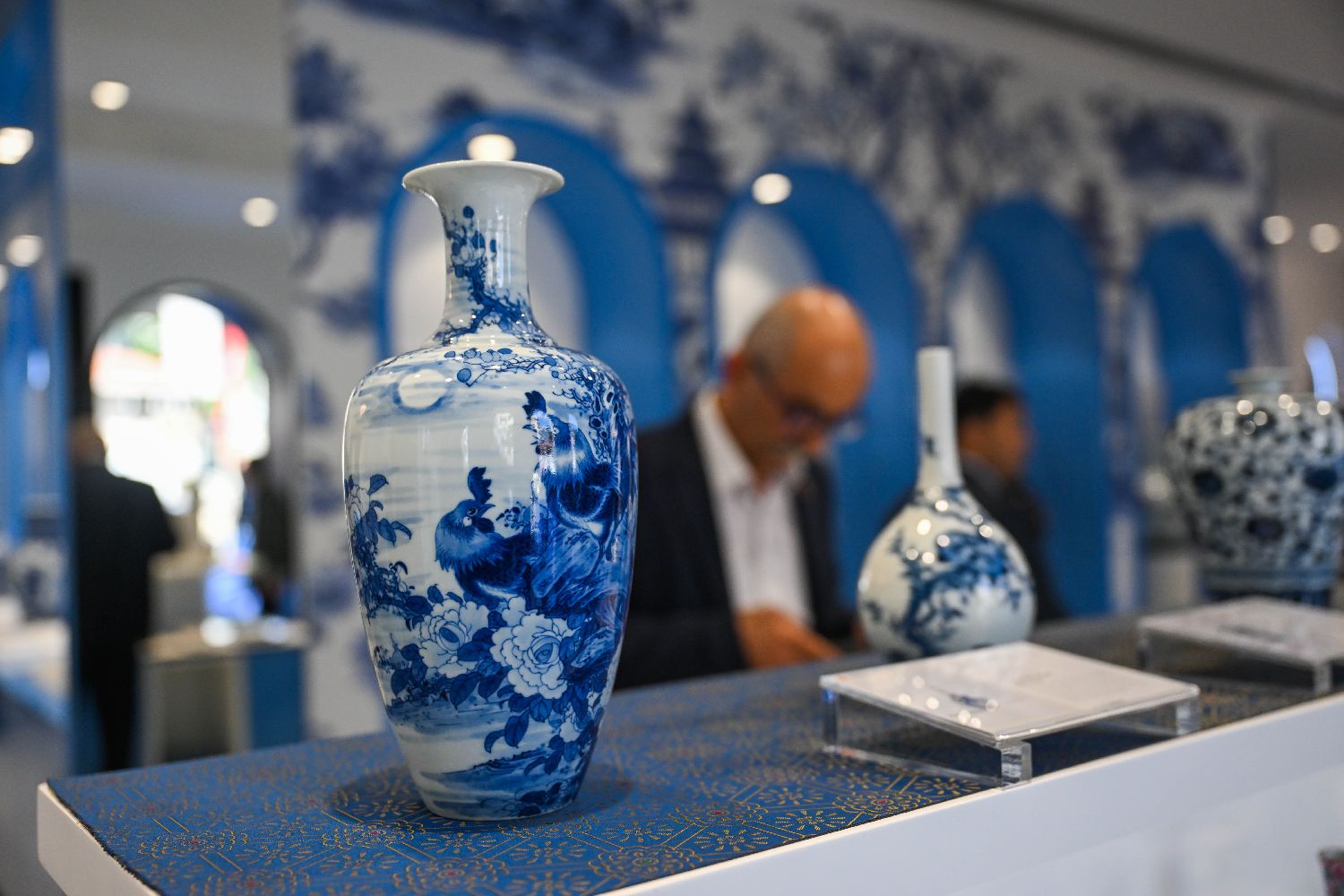 顾客在景德镇陶瓷官方旗舰店内查看中国瓷器。