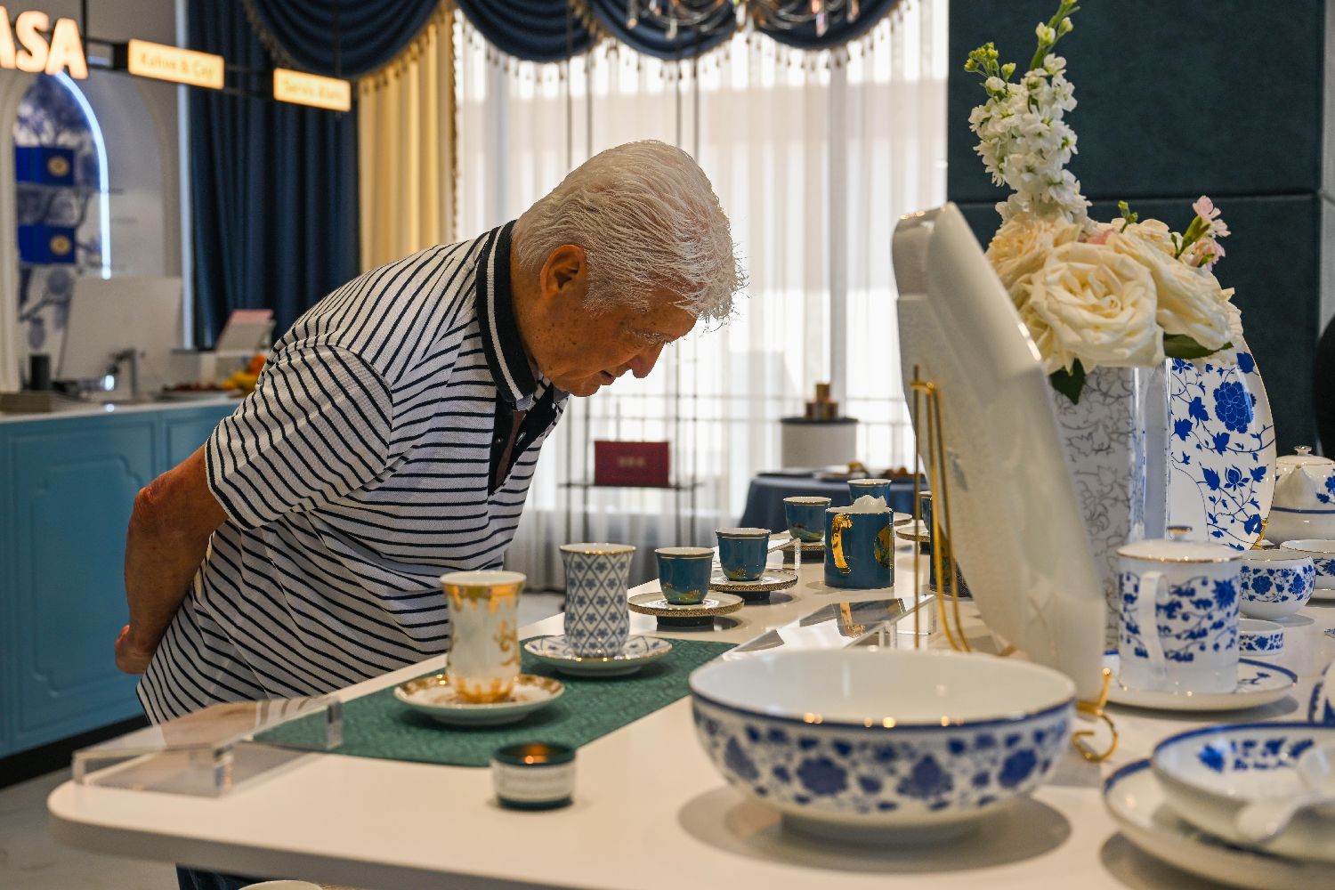 一名顾客在景德镇陶瓷官方旗舰店内查看中国瓷器。