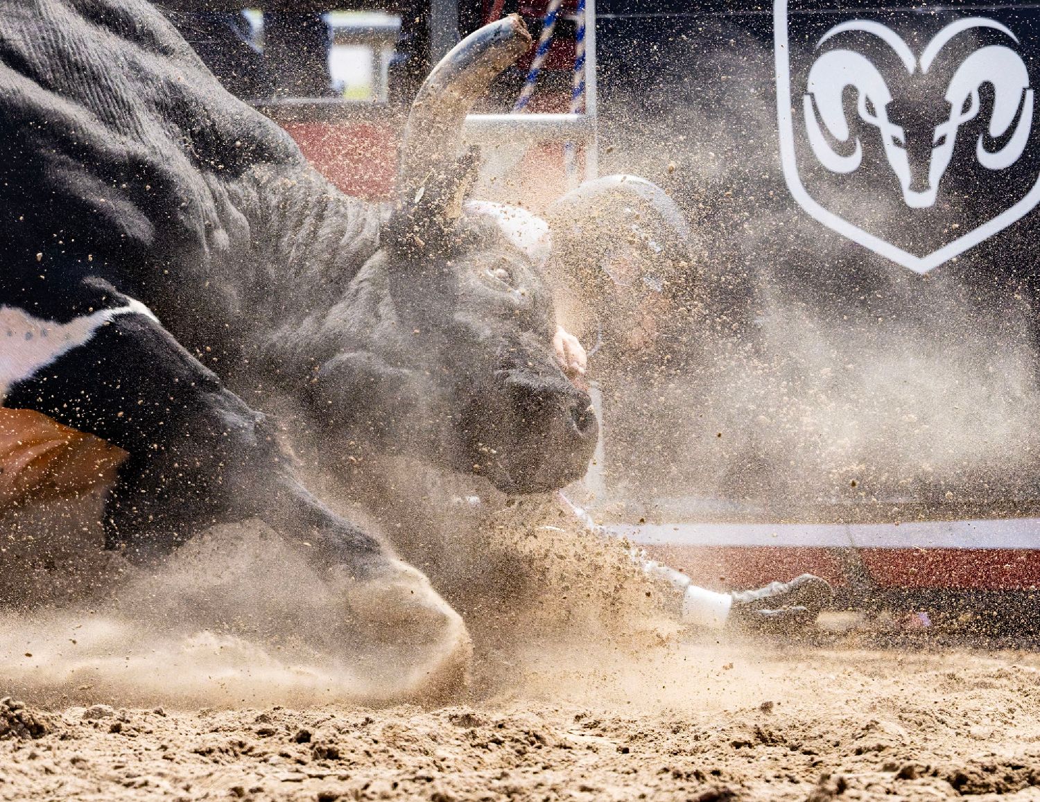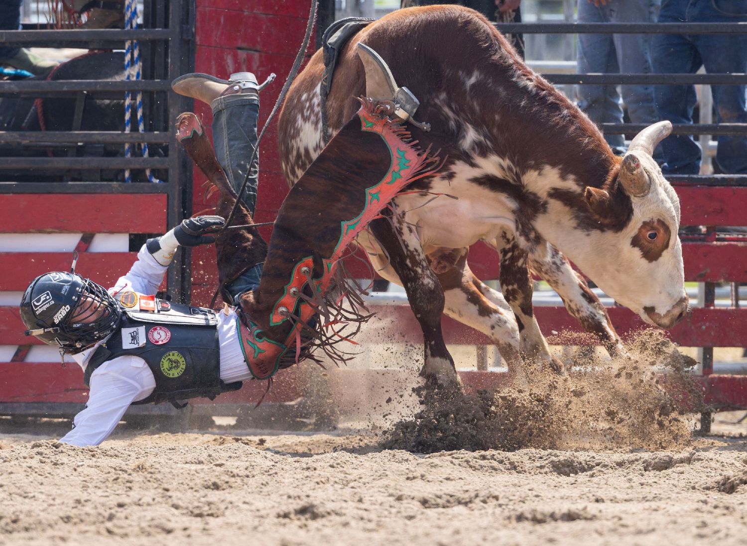 6月8日,一名牛仔在骑牛竞技赛中从牛背跌落。