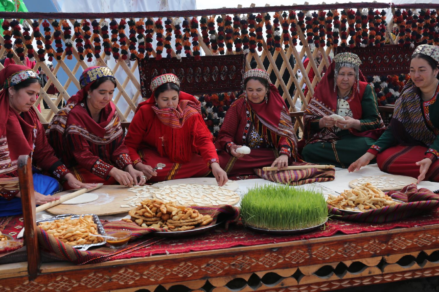 2015年3月21日,在土库曼斯坦首都阿什哈巴德,妇女们在庆祝纳乌鲁斯节活动中准备食品。纳乌鲁斯节(又称诺鲁孜节)是中亚国家最重要的传统节日之一,标志着春天的到来和新的一年开始。(图片来源:本文图片均自新华社)