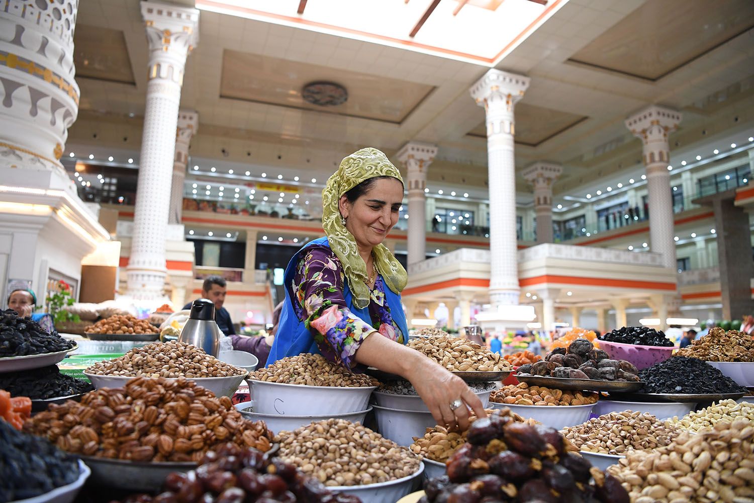 2019年6月10日,在塔吉克斯坦首都杜尚别,一名商贩售卖干果。越嚼越香的烤馕、香气四溢的抓饭、醇厚弹牙的马肠、甜美多汁的蔬果、独具风味的奶制品……中亚五国的餐桌,融合着游牧民族的传统饮食与丝绸之路的香料基因,为我们展现饮食文化交融中最生动的滋味。