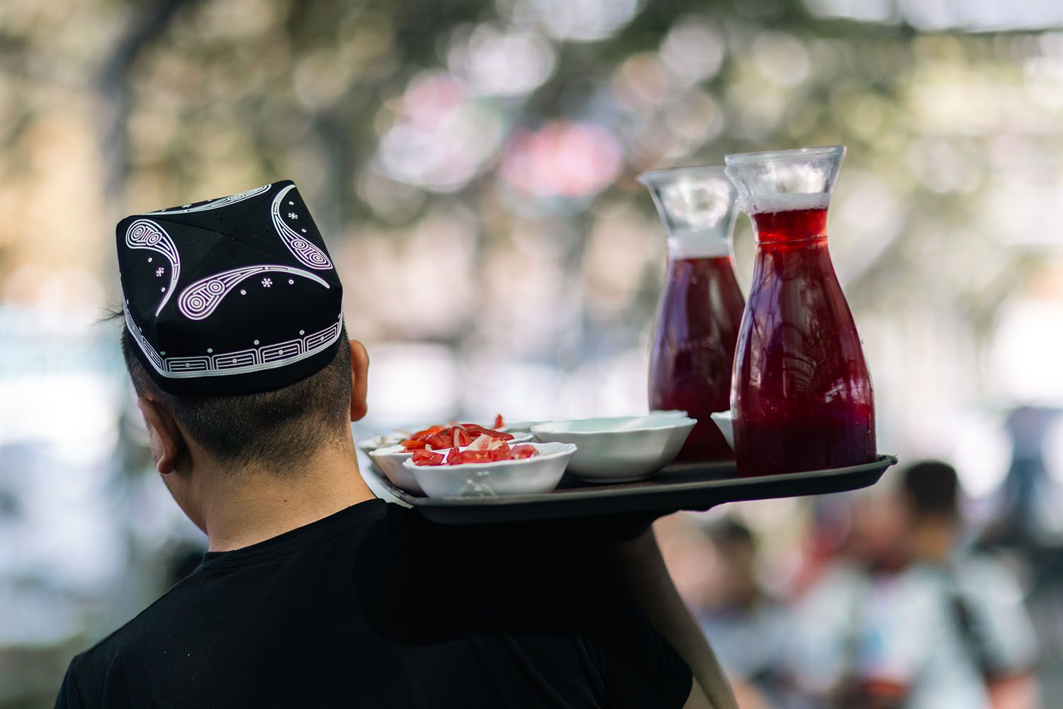 2023年9月14日,在乌兹别克斯坦首都塔什干,工作人员运送石榴汁。