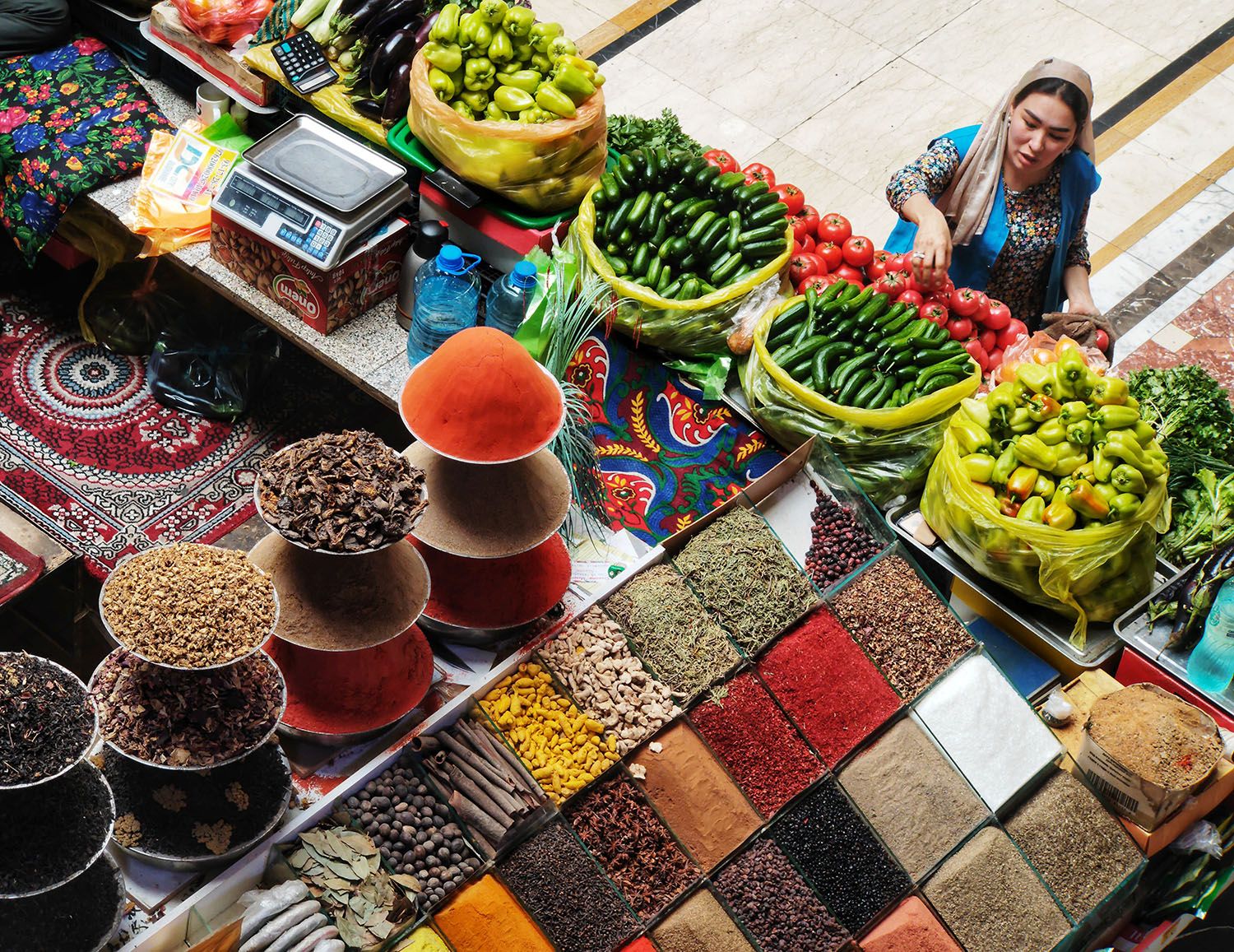2024年7月3日在塔吉克斯坦首都杜尚别拍摄的大巴扎内售卖的蔬菜和香料。