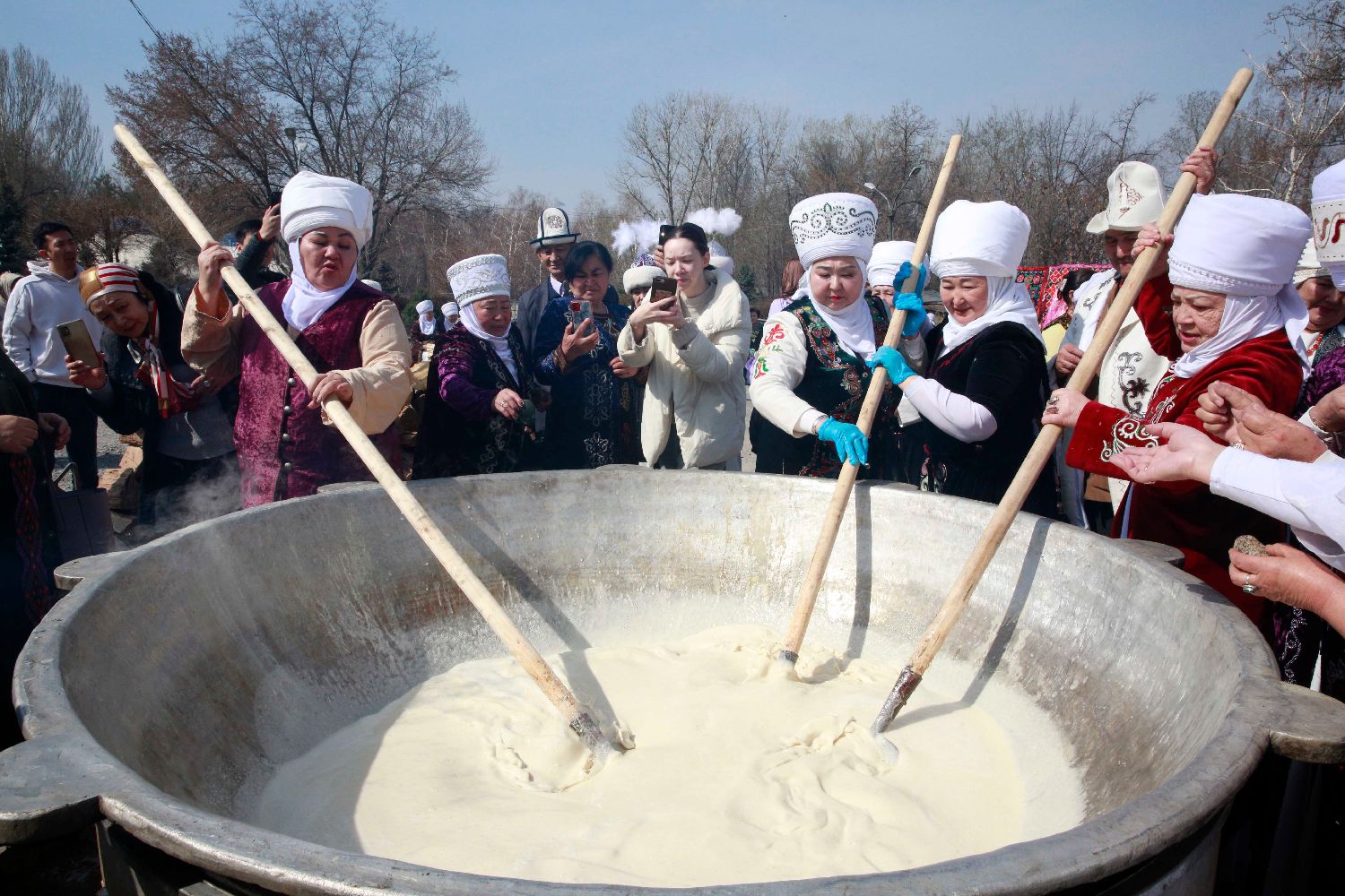 2023年3月20日,在吉尔吉斯斯坦首都比什凯克,人们制作特色食品庆祝纳乌鲁斯节。纳乌鲁斯节(又称诺鲁孜节)是中亚国家最重要的传统节日之一,标志着春天的到来和新的一年开始。