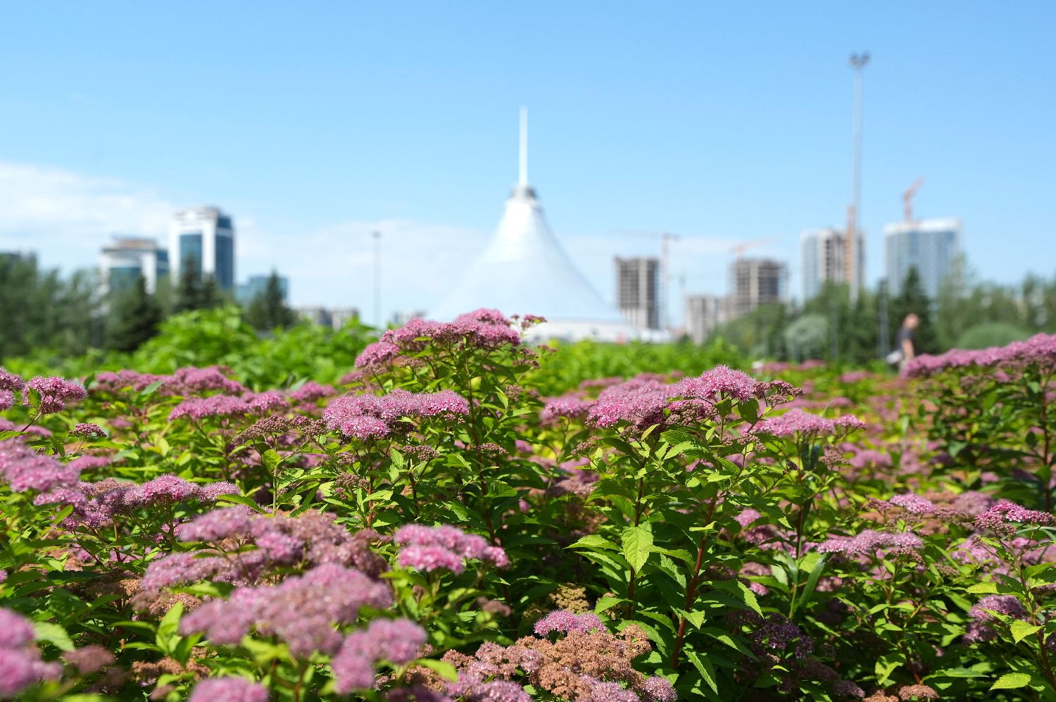夏日的阿斯塔纳,天气晴好、鲜花盛开,天际线在蓝天白云的映衬下格外美丽。图为6月14日在哈萨克斯坦首都阿斯塔纳拍摄的“可汗之帐”购物中心。(图片来源:本文图片均自新华社)