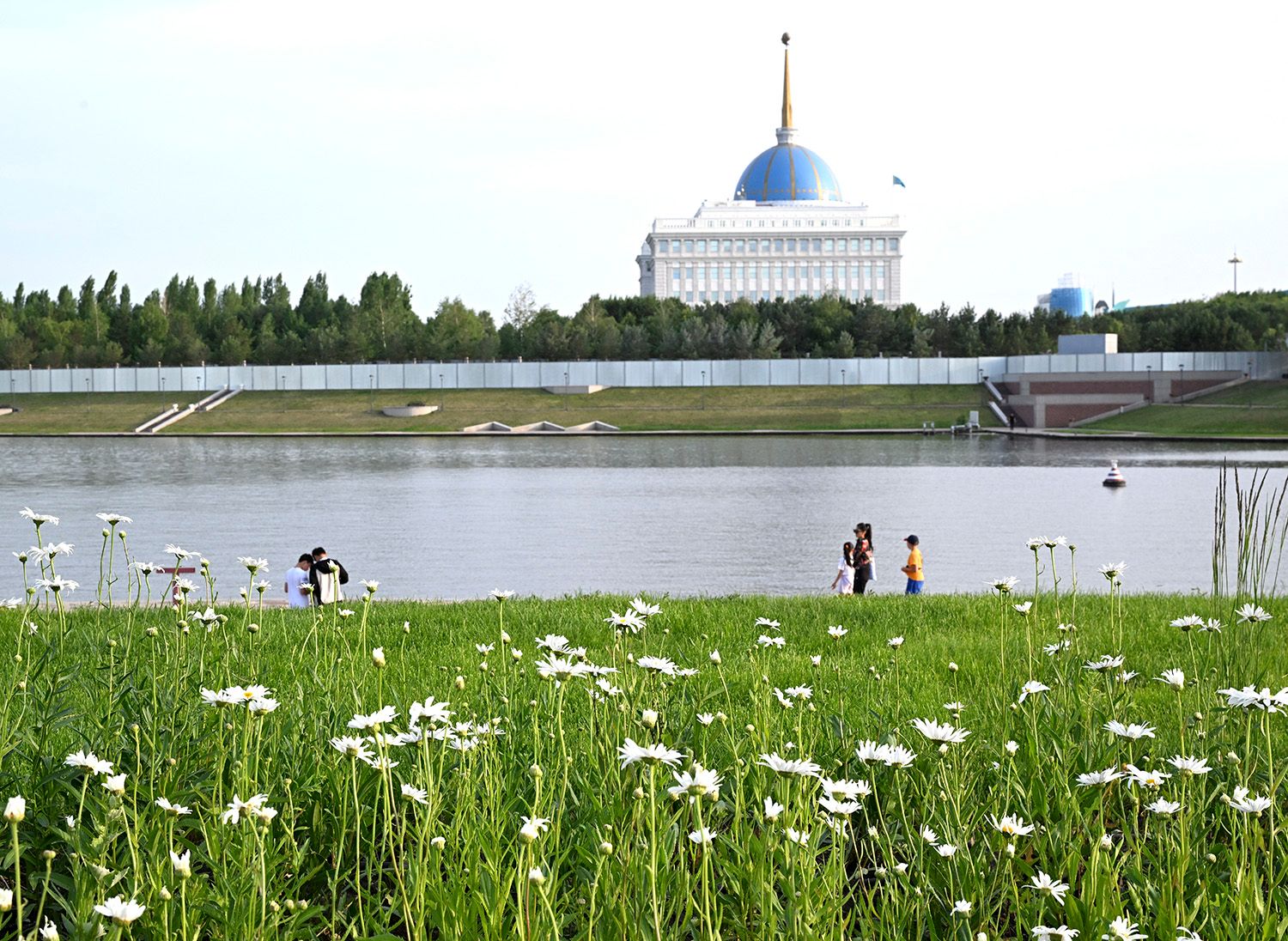 6月11日,民众在哈萨克斯坦首都阿斯塔纳的伊希姆河畔休闲。