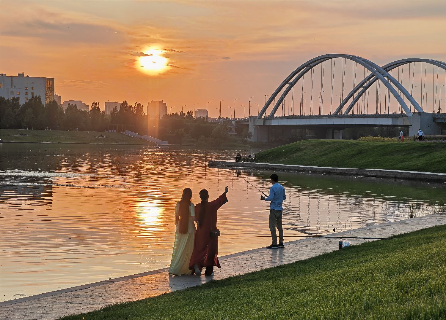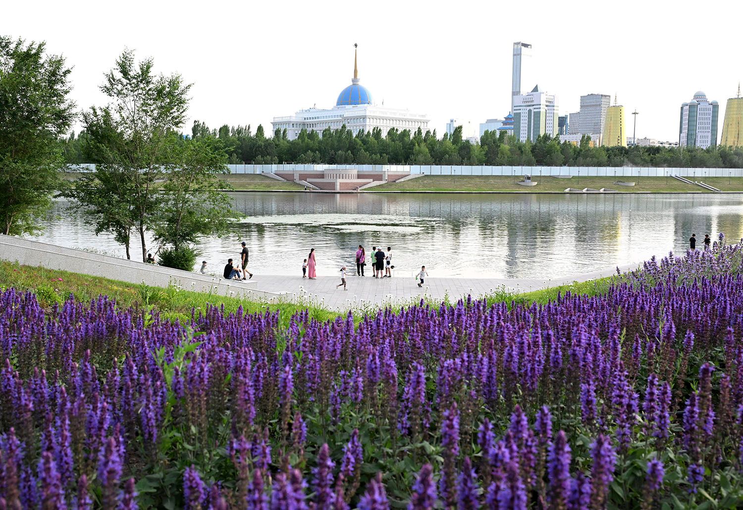 6月12日傍晚,民众在哈萨克斯坦首都阿斯塔纳的伊希姆河畔休闲。