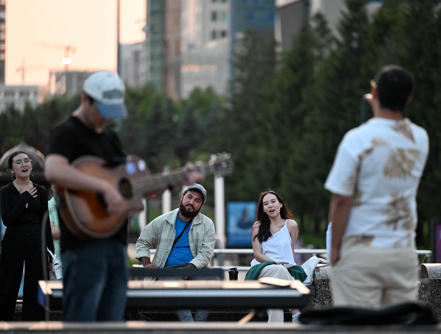6月11日,在哈萨克斯坦首都阿斯塔纳,民众欣赏街头歌手演唱歌曲。