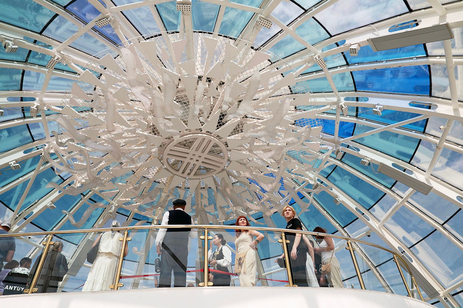 6月14日,在哈萨克斯坦首都阿斯塔纳,游客在巴伊杰列克观景塔塔顶参观。