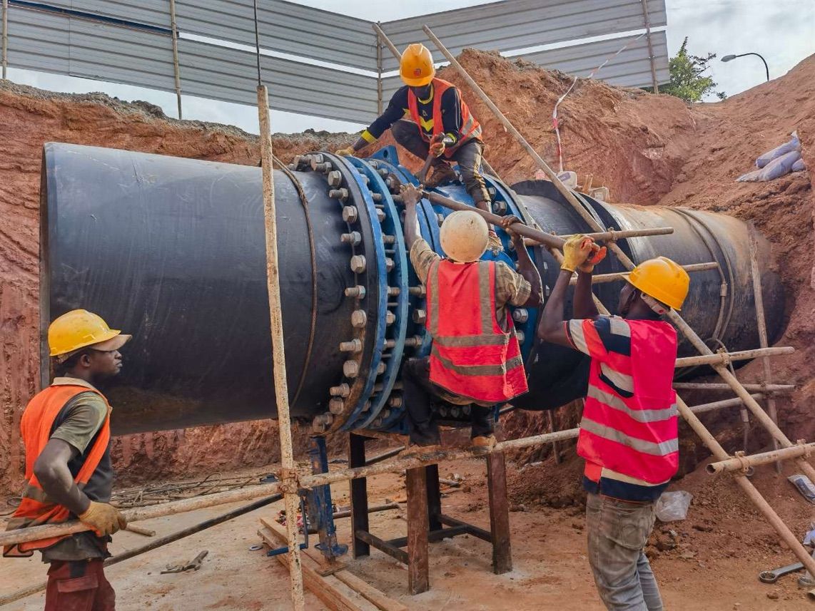 据悉,作为尼首都供水网络的“主动脉”,阿布贾大供水项目包括422公里新建供水管网,总供水能力达每天48万立方米,将有效解决尼首都地区有水厂供水但无管网输送的情况,打通供水系统“最后一公里”。图为2024年1月20日,工人在尼日利亚阿布贾大供水项目中检查输水管道。