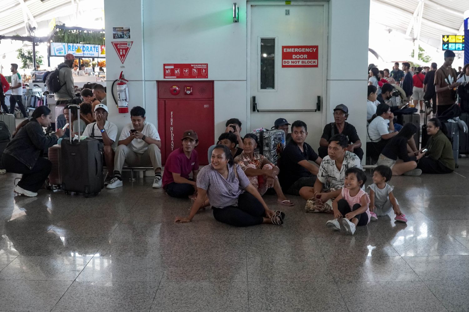 6月18日,在印度尼西亚巴厘岛,由于勒沃托比-拉基拉基火山喷发导致航班延误的乘客们在伍拉莱国际机场休息。