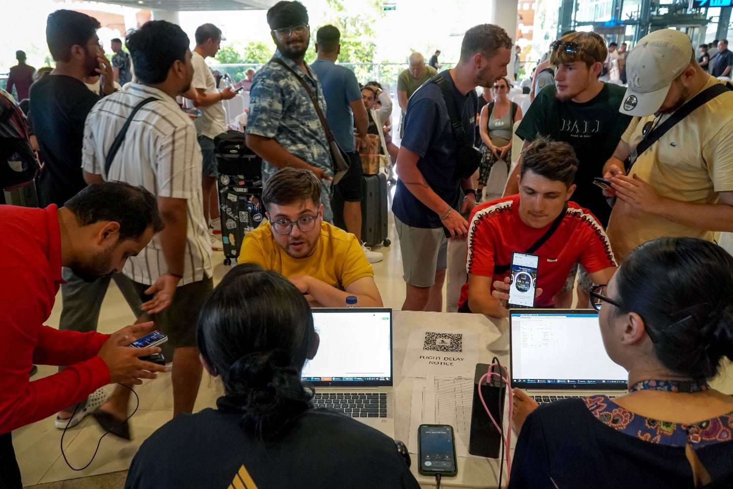 6月18日,在印度尼西亚巴厘岛伍拉莱国际机场,乘客们查看航班信息。