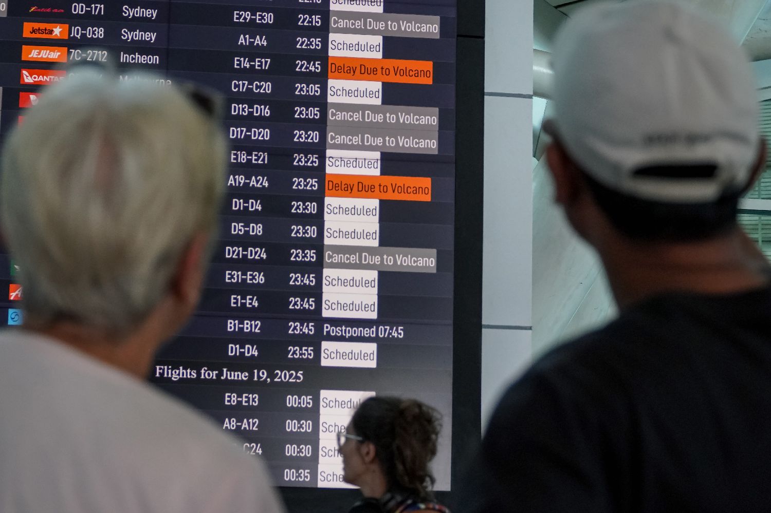 6月18日,在印度尼西亚巴厘岛伍拉莱国际机场,由于勒沃托比-拉基拉基火山喷发导致航班延误的乘客们询问信息。
