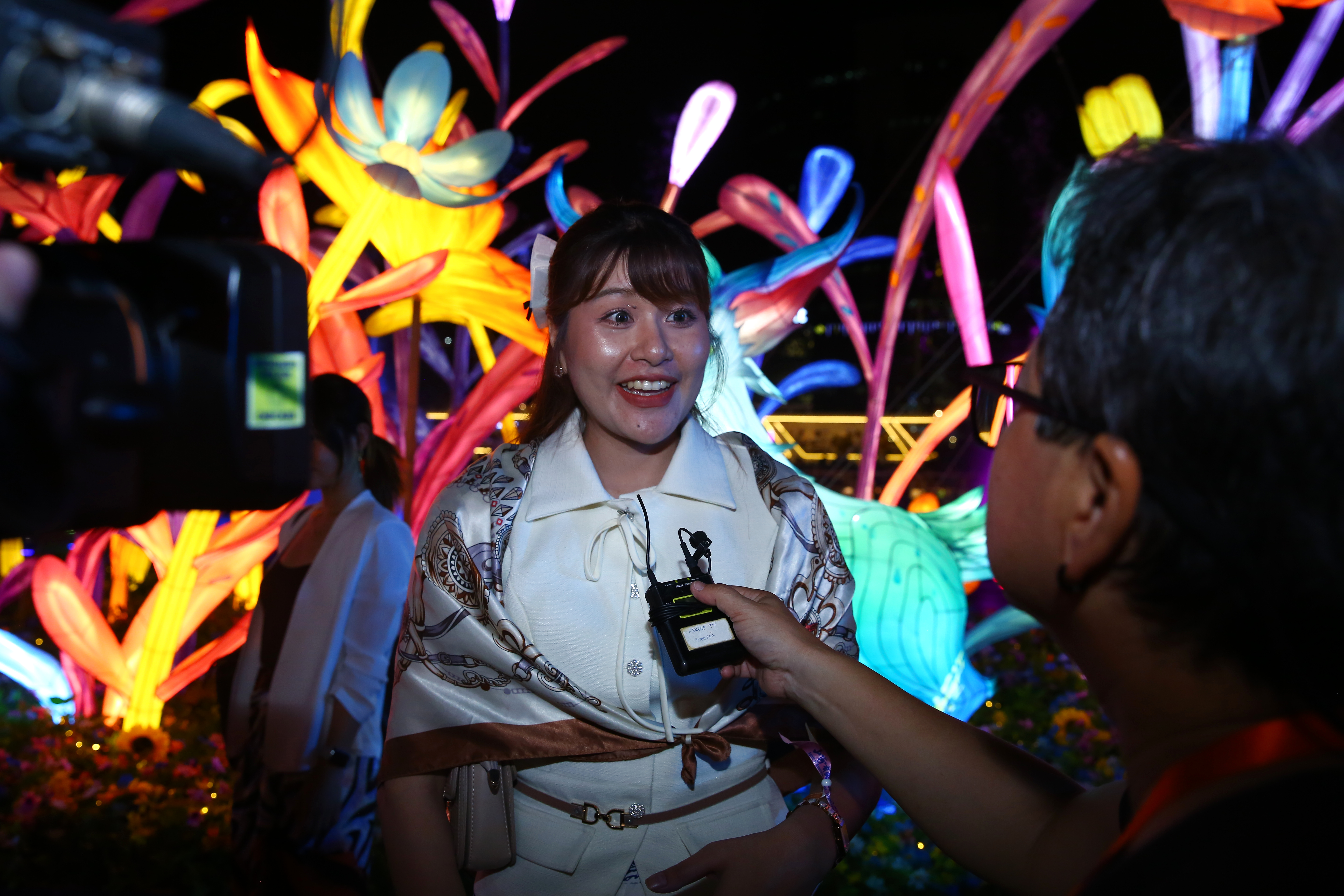 6月28日晚,在泰国曼谷商业地标暹罗天地,泰国姑娘莎拜在灯会上接受记者采访时说到:“我是第一次现场看这样的灯会,感觉很震撼。”