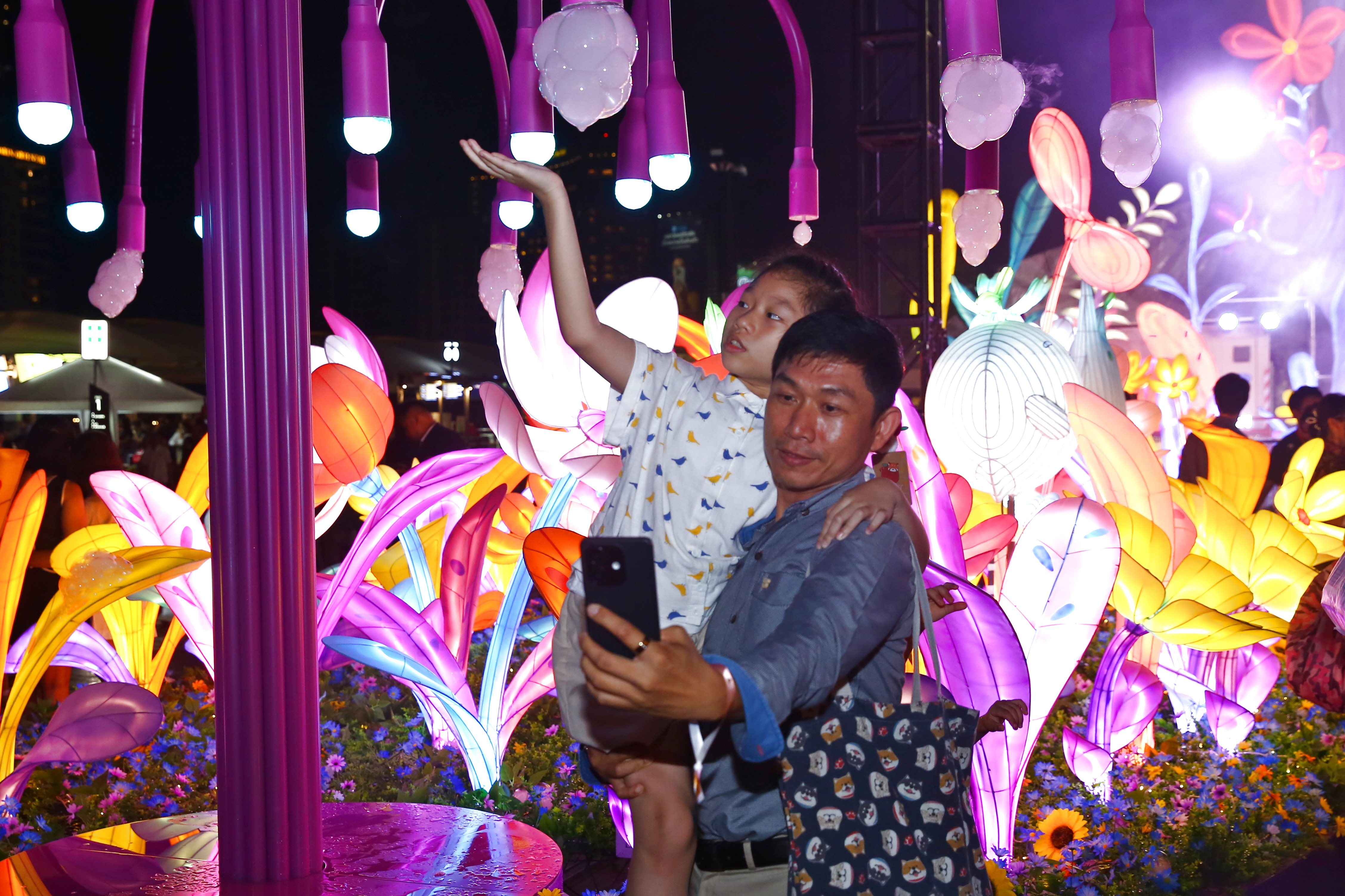 6月28日晚,在泰国曼谷商业地标暹罗天地,游客在灯会上拍照。