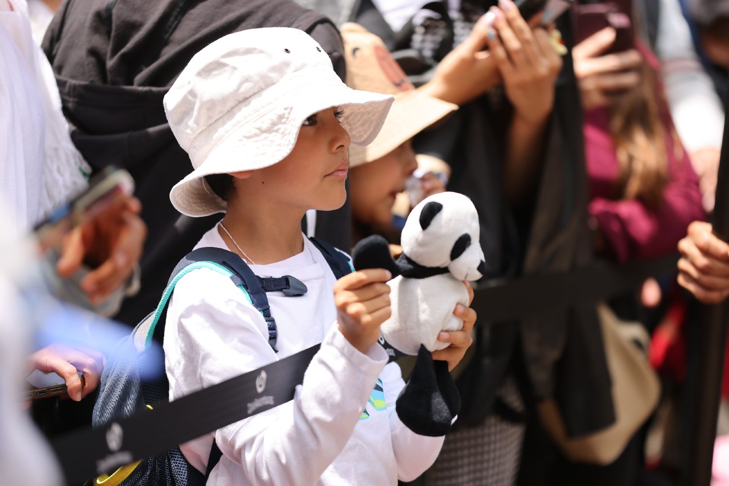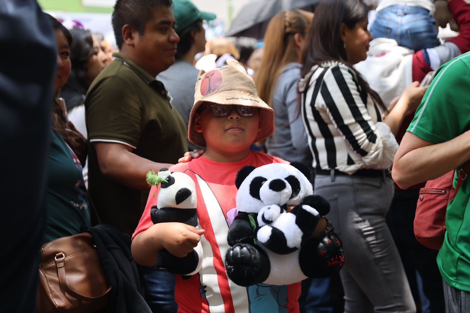 6月29日,在墨西哥首都墨西哥城查普特佩克动物园,游客抱着大熊猫玩偶参加“欣欣”的生日庆祝活动。