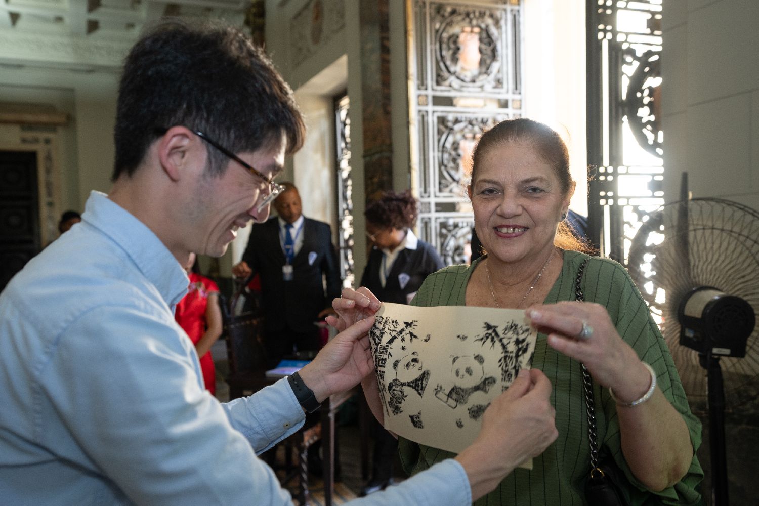 6月30日,在巴西里约热内卢蒂拉登特斯宫,一位巴西参观者(右)展示刚刚完成的拓印作品。展览汇集了各种中国传统工艺品,通过展示与互动体验,向巴西民众呈现中国手工艺的匠心魅力与当代表达,吸引众多观众驻足观看与交流。(图片来源:本文图片均自新华社)