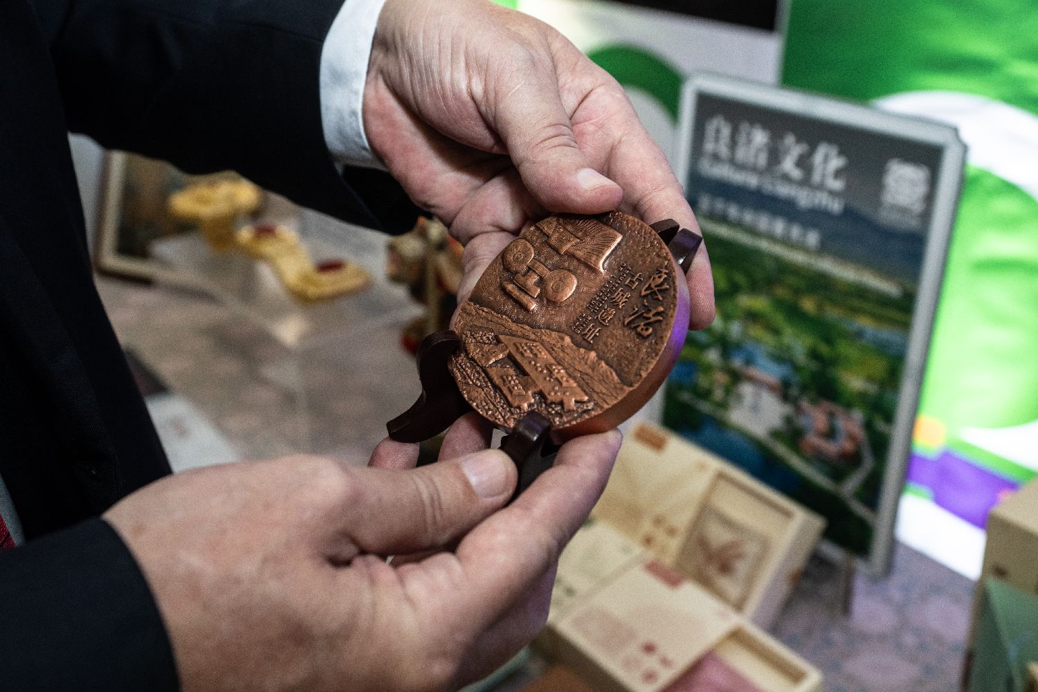 6月30日,在巴西里约热内卢蒂拉登特斯宫,一名参观者欣赏“良渚文化”主题工艺品。当天,“幸会·巴西”杭州传统工艺创新展在巴西里约热内卢蒂拉登特斯宫举行。