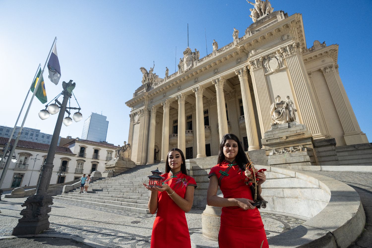 两位身着中国传统服饰的青年志愿者在巴西里约热内卢蒂拉登特斯宫外展示中国元素工艺品。