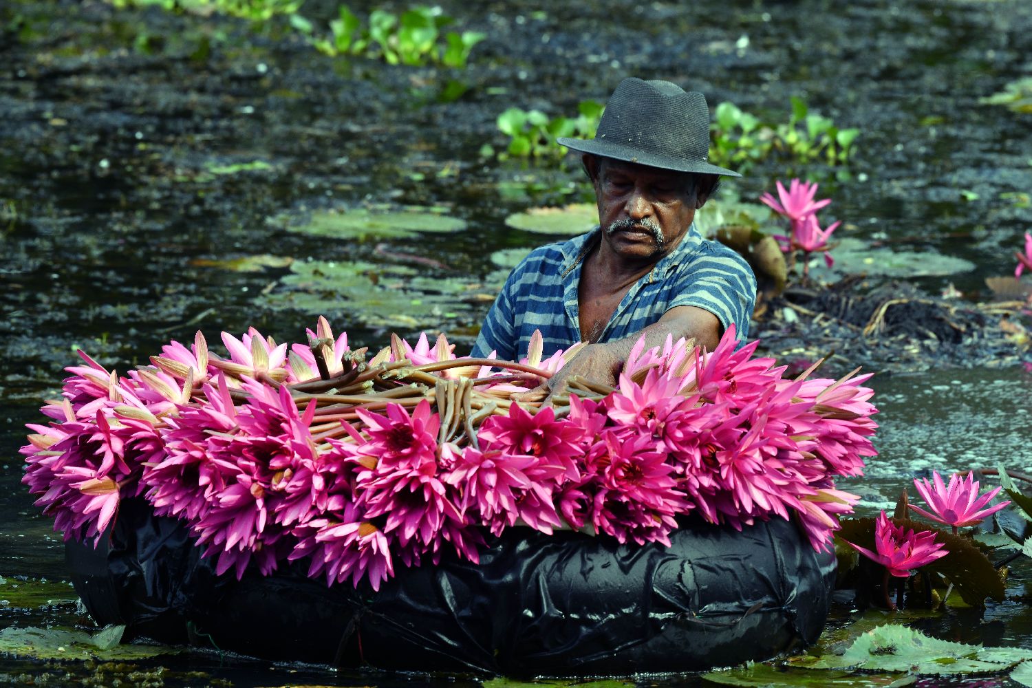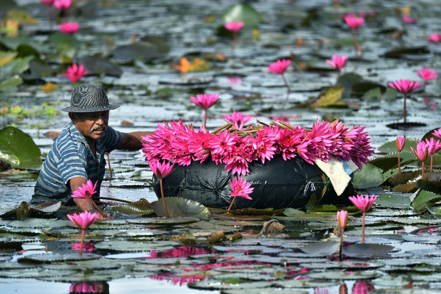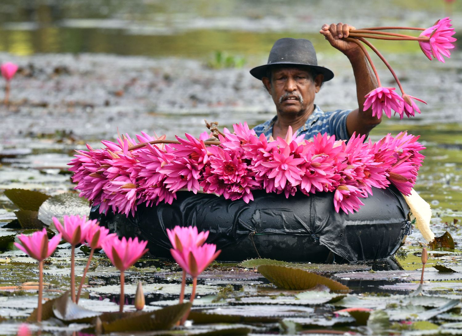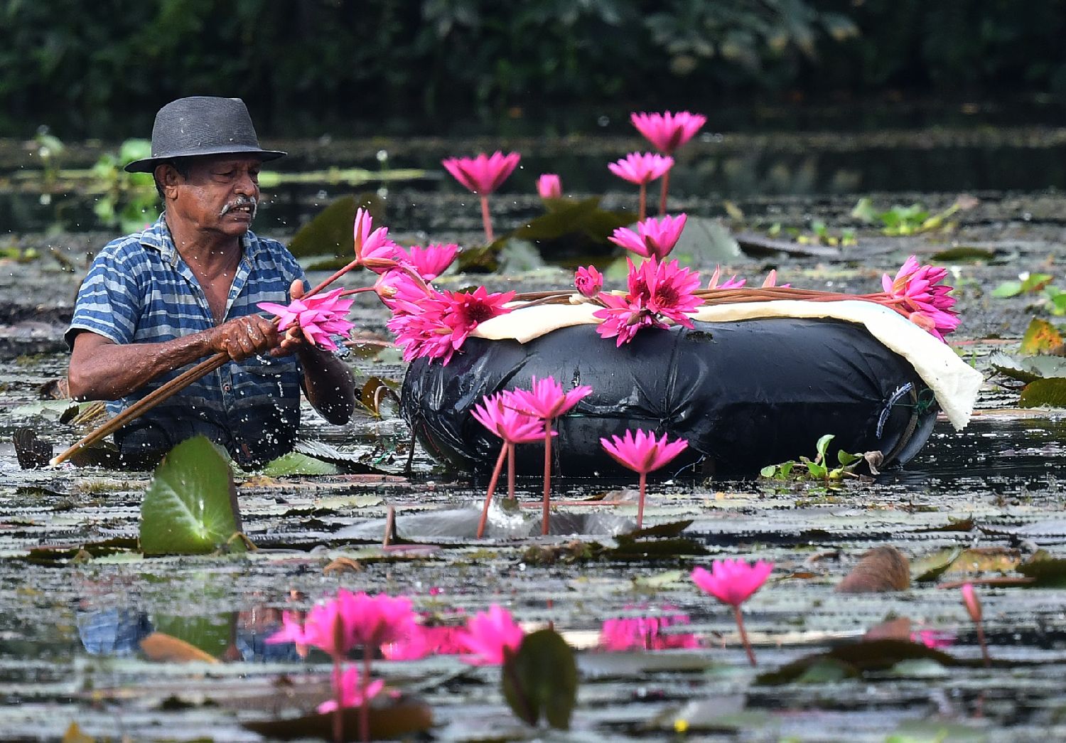 7月1日,一名男子在斯里兰卡首都科伦坡郊区霍坎达拉的湖泊中采集粉色睡莲。