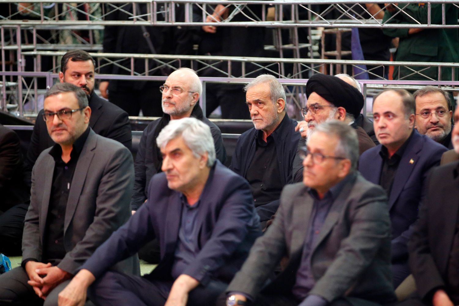 7月2日,伊朗首都德黑兰,伊朗总统佩泽希齐扬(后排左三)、伊朗议会议长卡利巴夫(后排左二)参加纪念仪式。