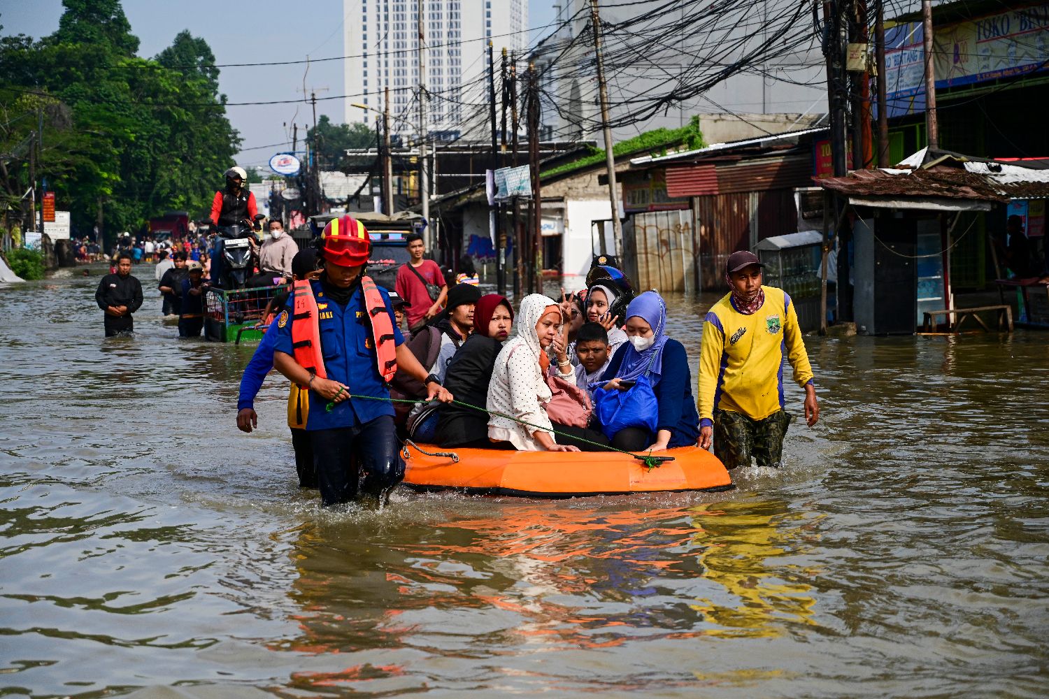 7月8日,在印度尼西亚万丹省唐格朗,救援人员转移受洪水影响的居民。