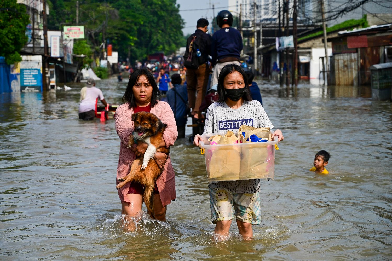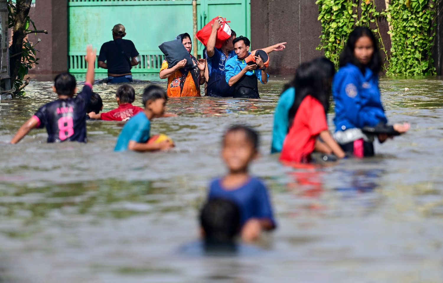 7月8日,在印度尼西亚万丹省唐格朗,人们在洪水中前行。