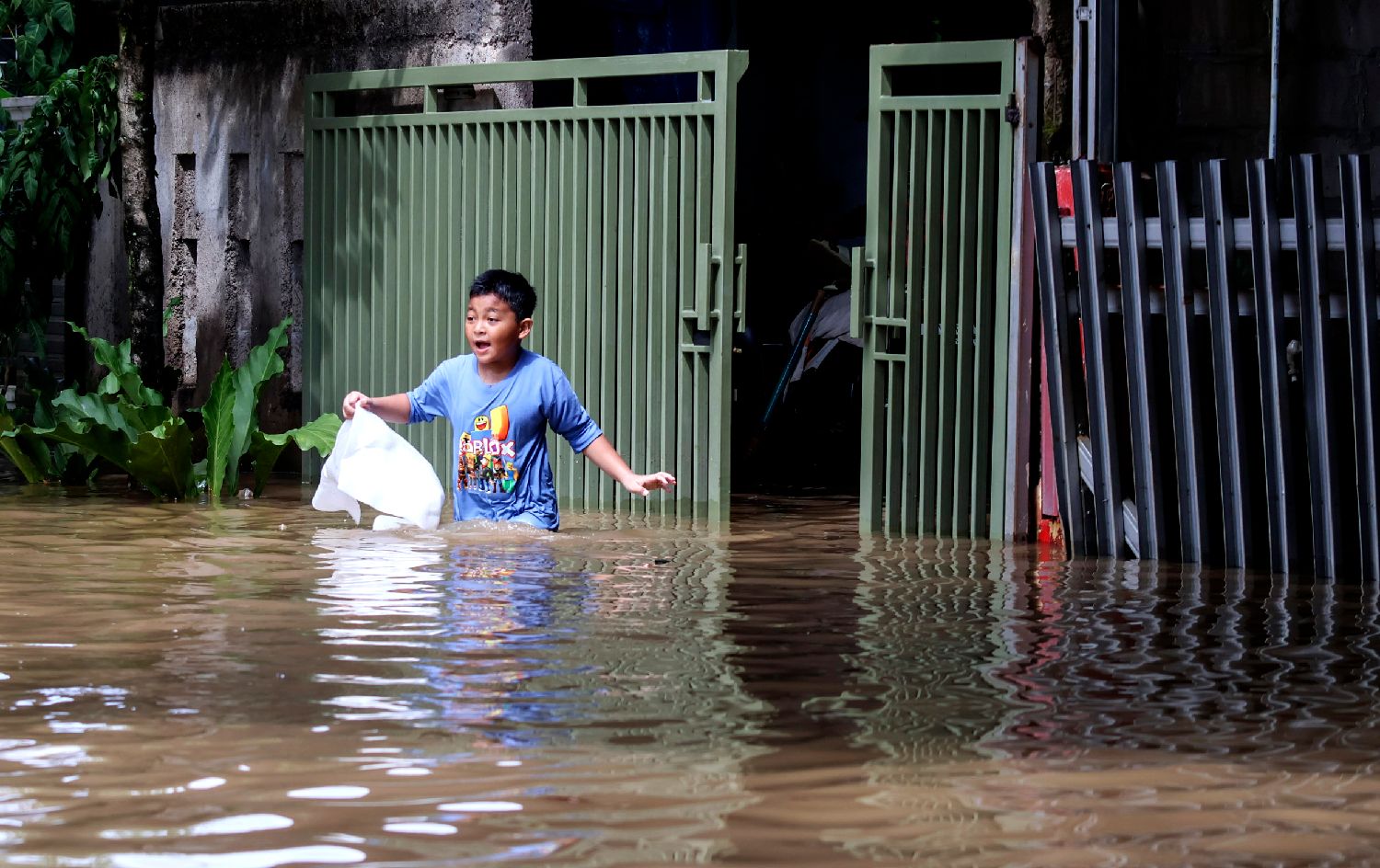 7月8日,在印度尼西亚爪哇省茂物,一名男孩在洪水中前行。