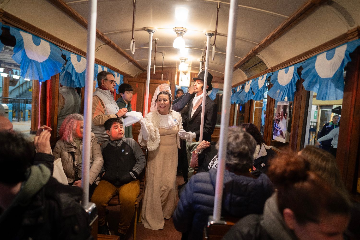 7月9日凌晨,身着历史服饰的演员在阿根廷布宜诺斯艾利斯地铁A线车厢内表演。
