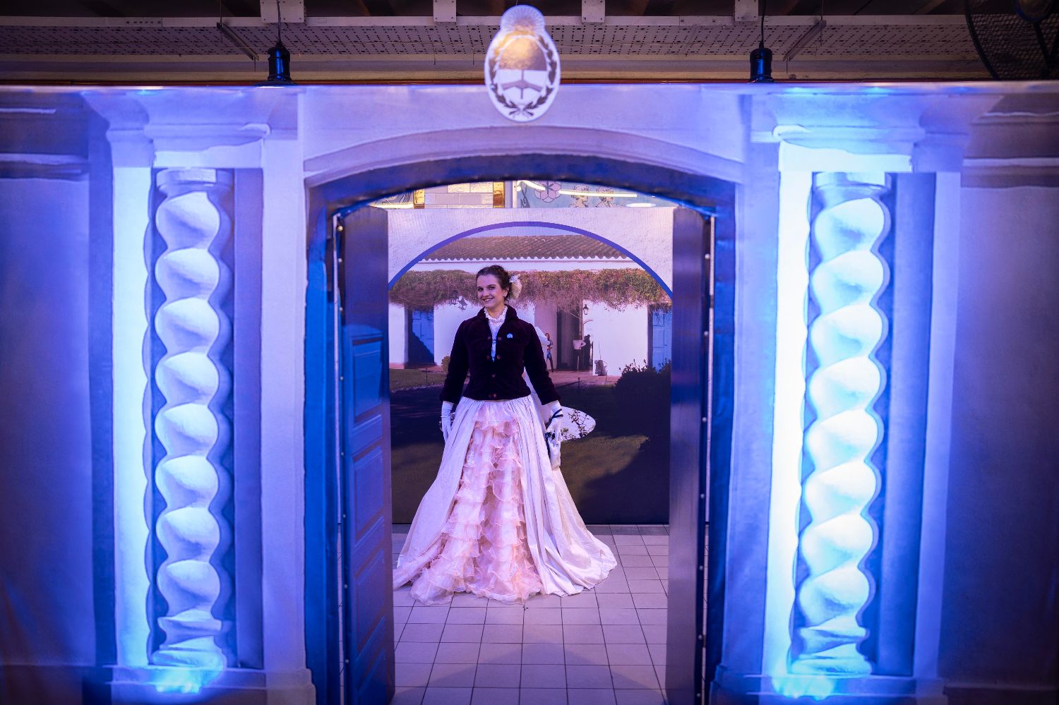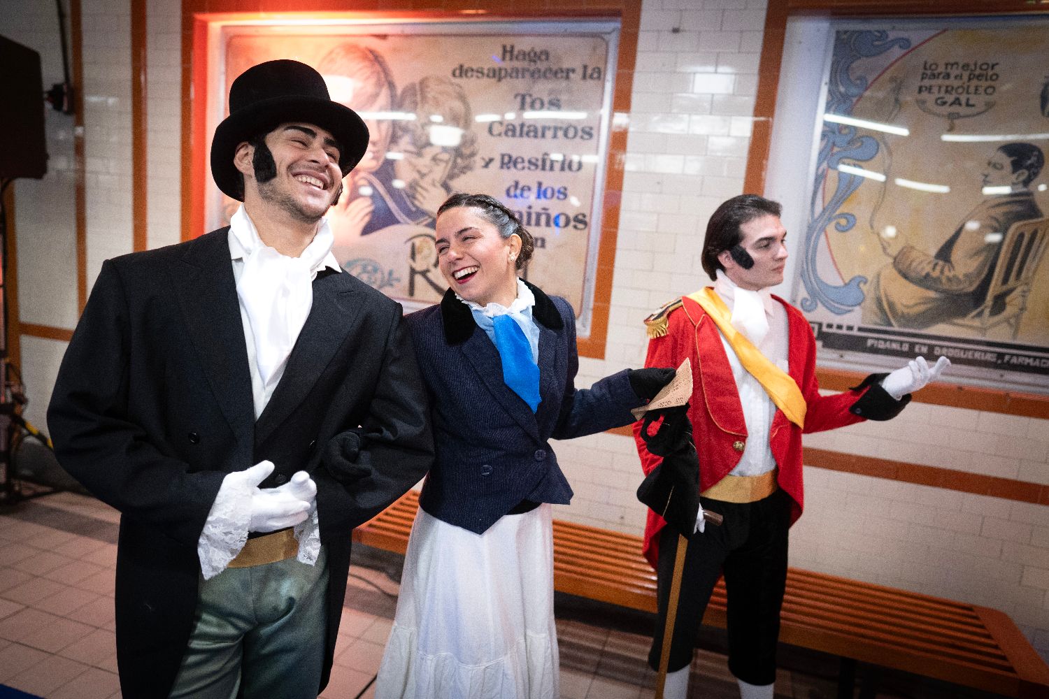 7月9日凌晨,身着历史服饰的演员在阿根廷布宜诺斯艾利斯地铁A线内搭建的“独立宣言”复制场景前留影。