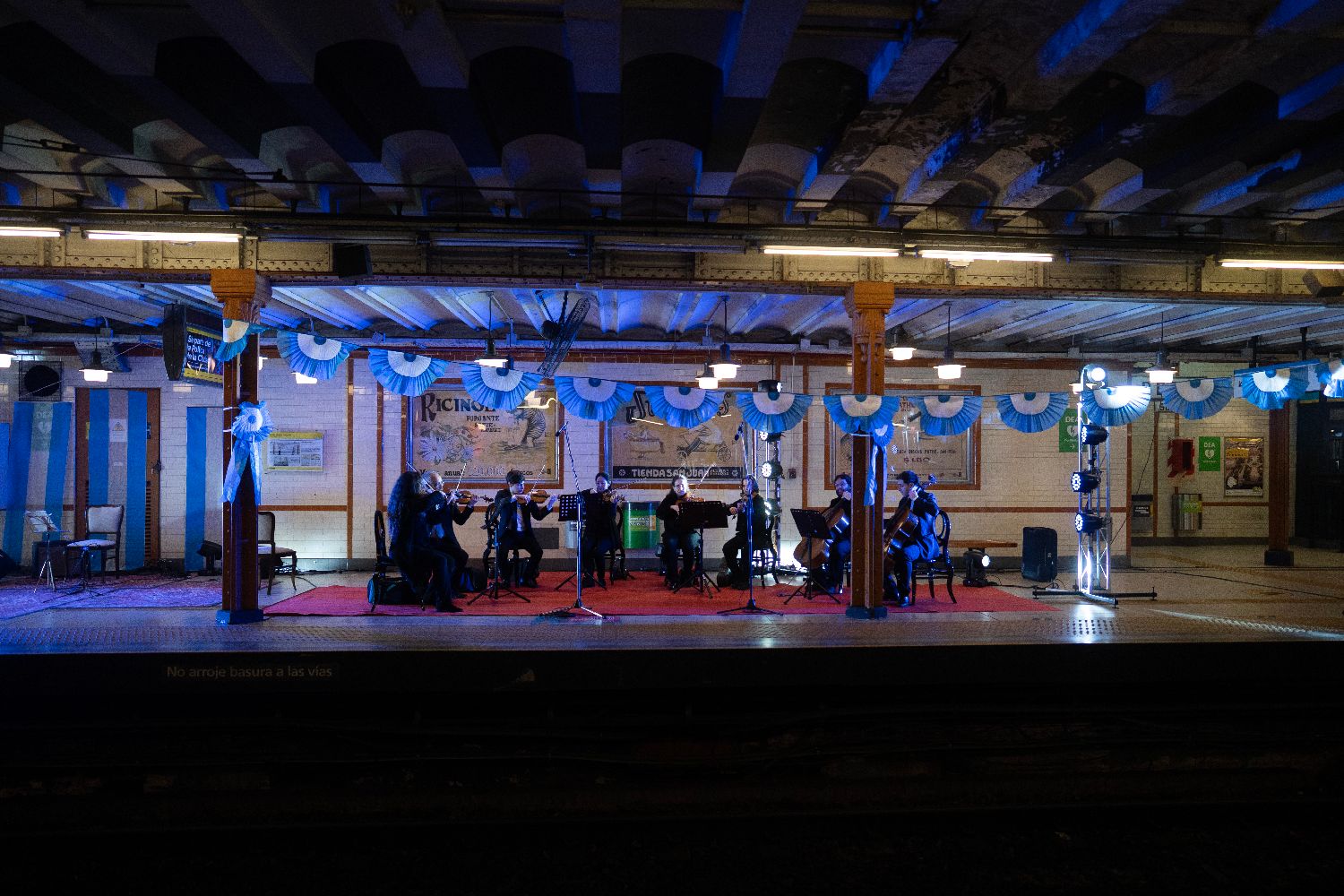 7月8日夜间,乐队在阿根廷布宜诺斯艾利斯地铁A线站台上表演。