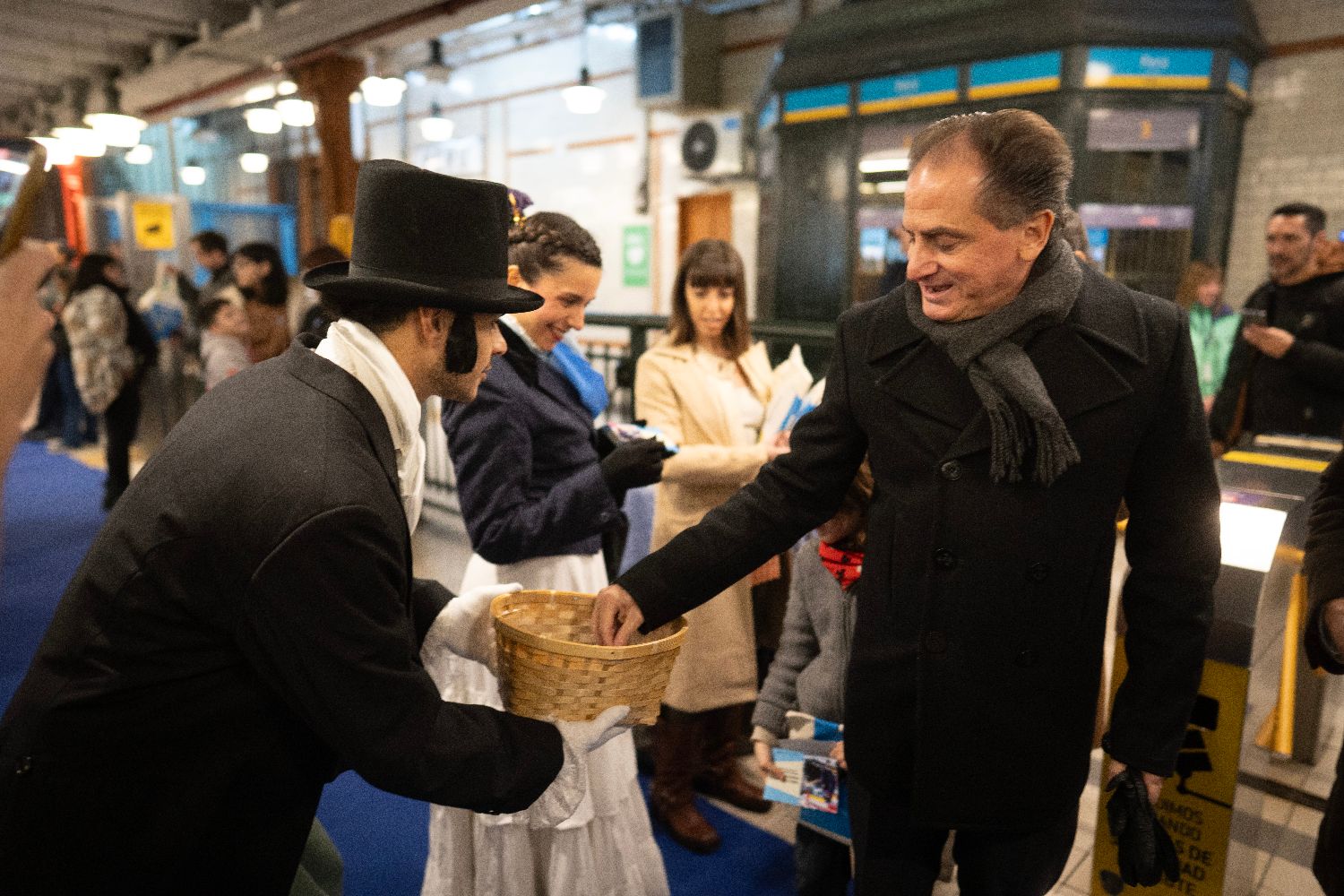 7月8日夜间,身着历史服饰的演员在阿根廷布宜诺斯艾利斯地铁站内向游客赠送独立日纪念胸花。