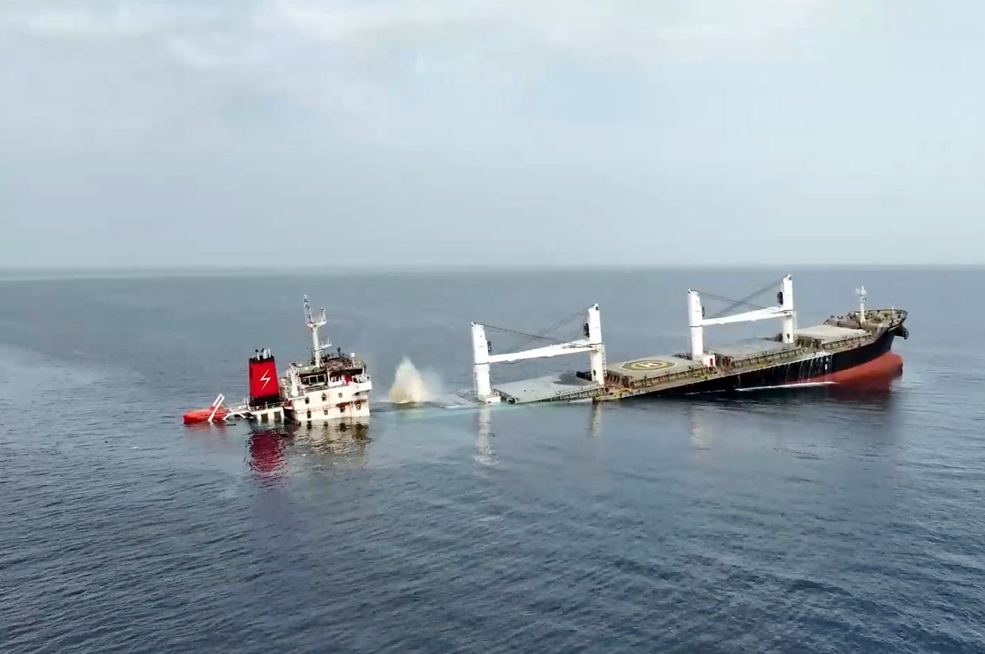 据胡塞武装旗下的马西拉电视台报道,袭击发生于7月7日,地点在也门荷台达港以西约51海里处。受袭货轮于7月9日凌晨沉没。这是该组织4天内在红海击沉的第二艘货轮。图为也门胡塞武装公布的影像显示,7月8日,在红海航行的希腊货轮“永恒C”号遭袭后倾斜下沉。(图片来源:本文图片均自新华社发/胡塞媒体中心供图)