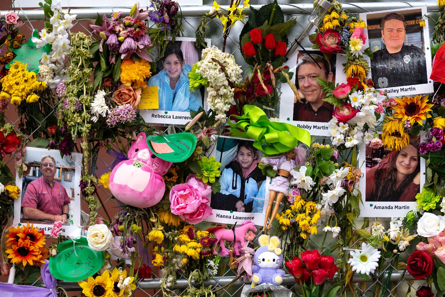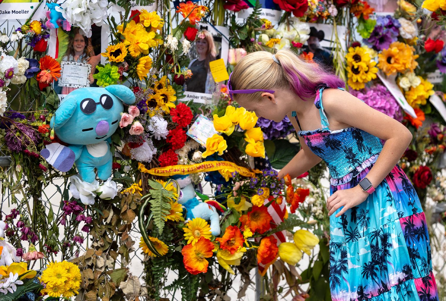 7月12日,一名女孩在美国得克萨斯州克尔维尔献花悼念洪灾遇难者。截至美国中部时间7月11日夜间,得克萨斯州7月4日暴雨引发的洪灾已造成至少129人死亡,目前仍有166人失踪。(图片来源:本文图片均自新华社)