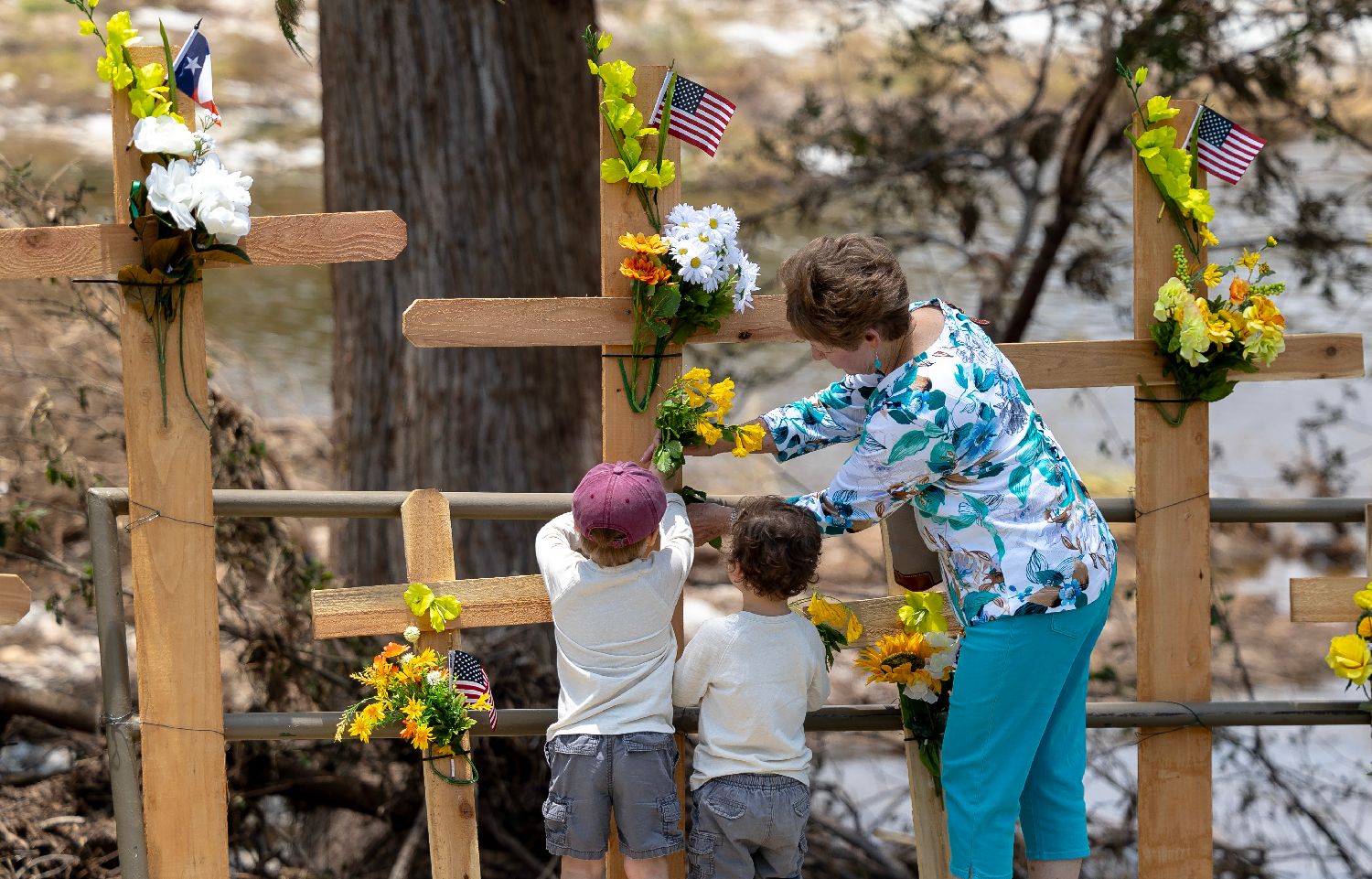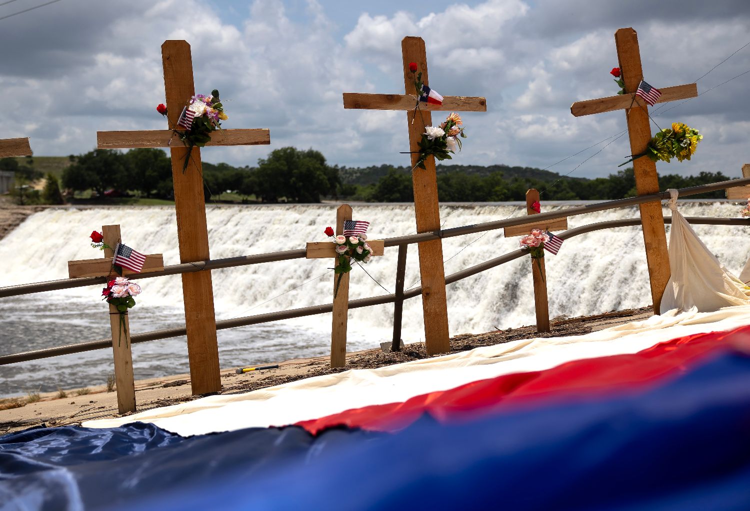 7月12日,悼念洪灾遇难者的十字架竖立在美国得克萨斯州瓜达卢普河岸边。