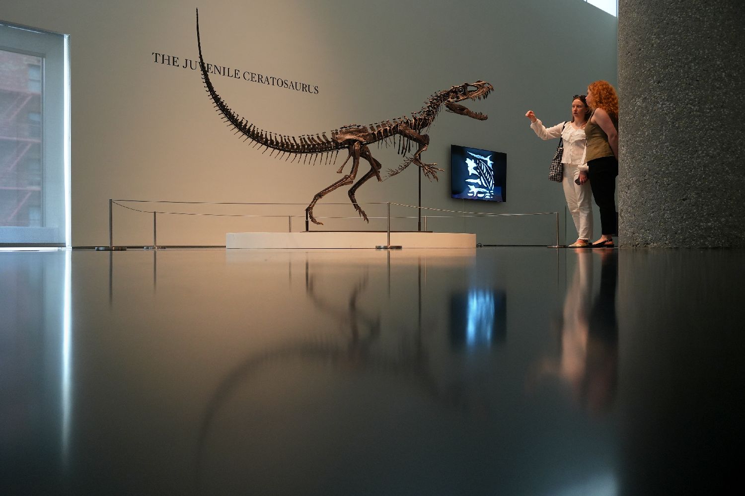 当地时间7月15日,一具珍稀的幼年角鼻龙骨骼化石在纽约苏富比拍卖行进行拍前展览。