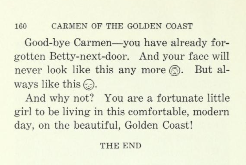 1935年的印刷书籍中出现了与文字衔接的哭脸和笑脸符号。(图片来源:《黄金海岸的卡门》)