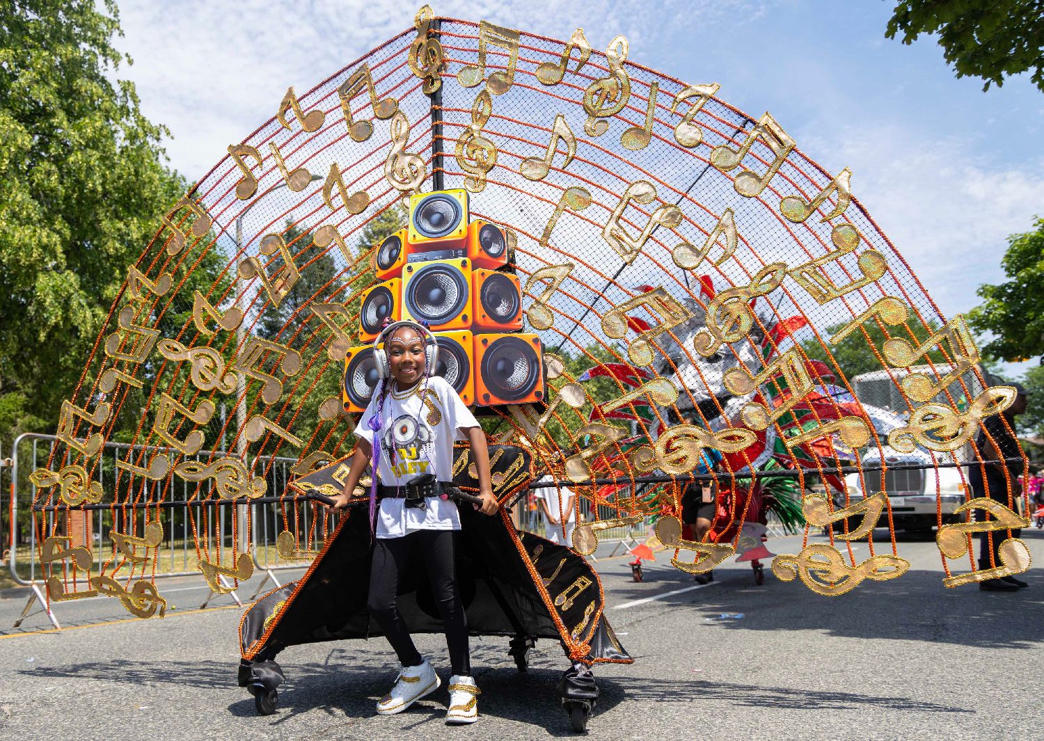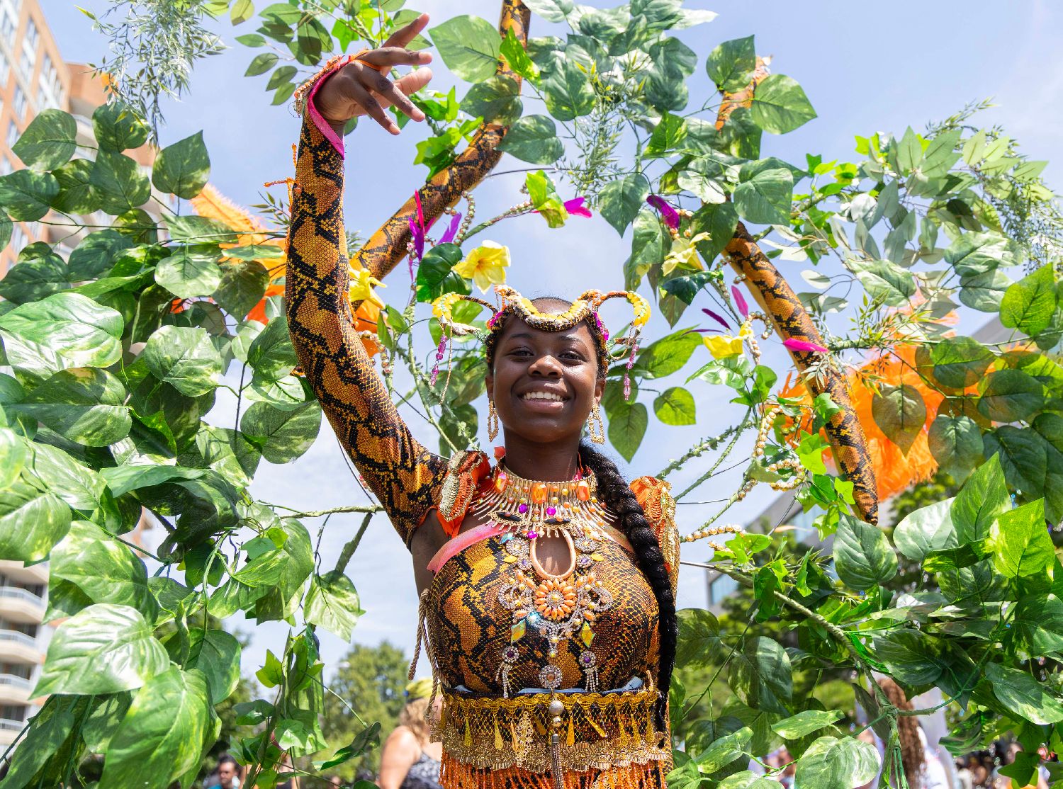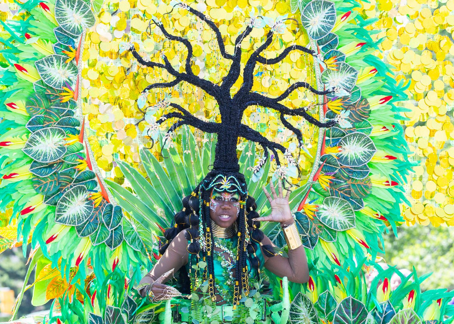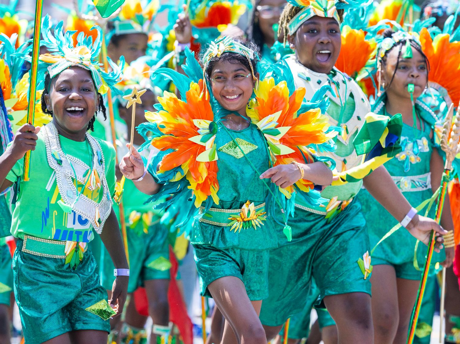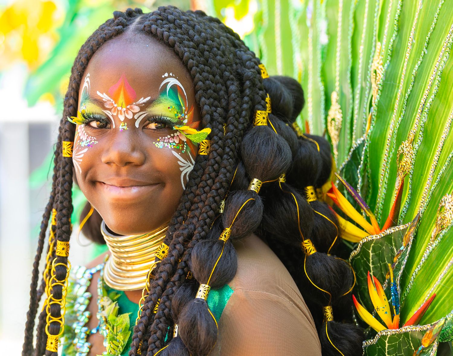 一名女孩盛装参加加勒比狂欢节青少年游行。