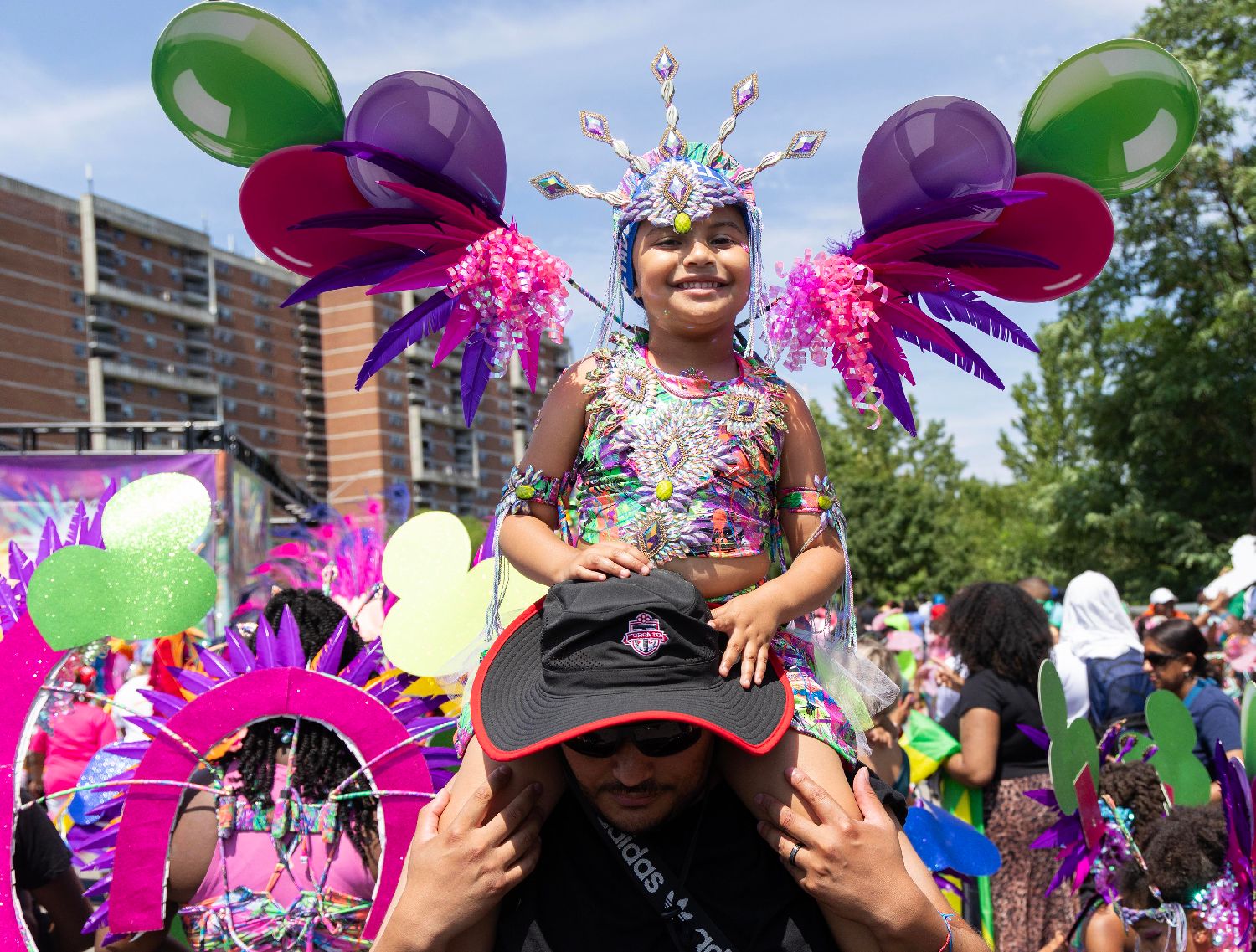 一名女孩坐在父亲肩头参加加勒比狂欢节青少年游行。